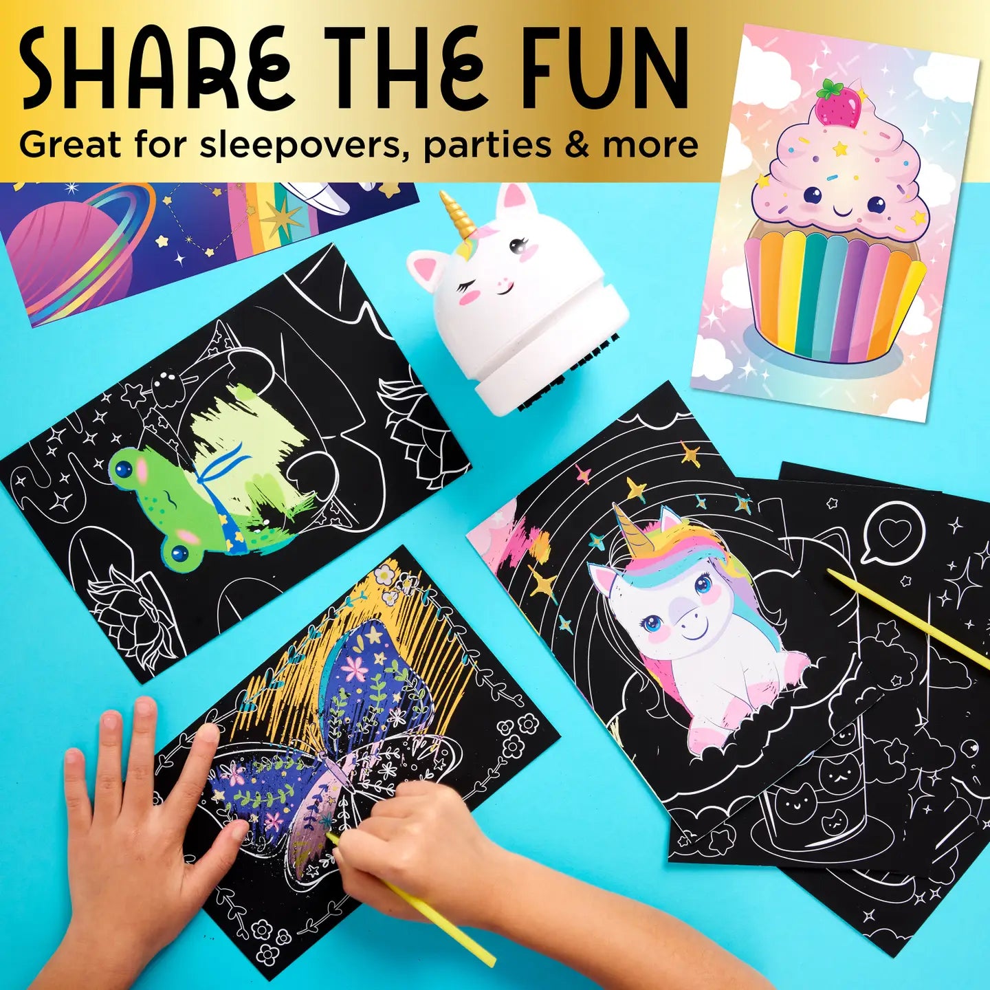 Ready for a new Deluxe Scratch Art experience? Our less-mess, more fun scratch art kit with a mini unicorn desk vacuum is ready to sweep your crafting crumbs away!  Scratch your papers to reveal 20 fun designs in foil and rainbow. Includes 20 sheets and 2 scratching tools. Ages 6+