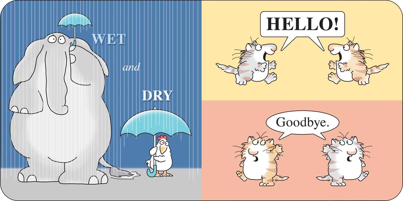Boynton’s delightful rhyming text and whimsical cast of animal characters, who play on a teeter totter, lift weights, talk on the phone, and hide under umbrellas, perfectly complement the concept of opposites while introducing little readers to new words and juxtaposing ideas.