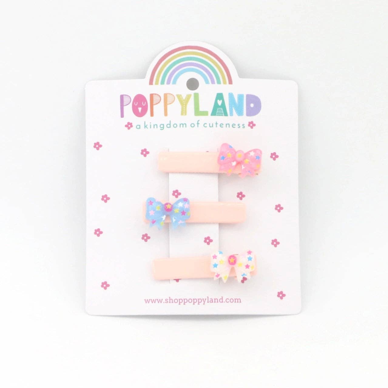 Nothing sweeter than little girls wearing bows! Our Bow Trio hair pin set is great for the girl on the go. Pin their hair back with these pastel bows on hair pins for a touch of charm and ease. At Poppyland, a kingdom of cuteness, we value both style and practicality, ensuring your little princess looks adorable while staying comfortable. Add a sprinkle of magic to her daily adventures with our delightful Bow Trio Princess Hair Pins.
