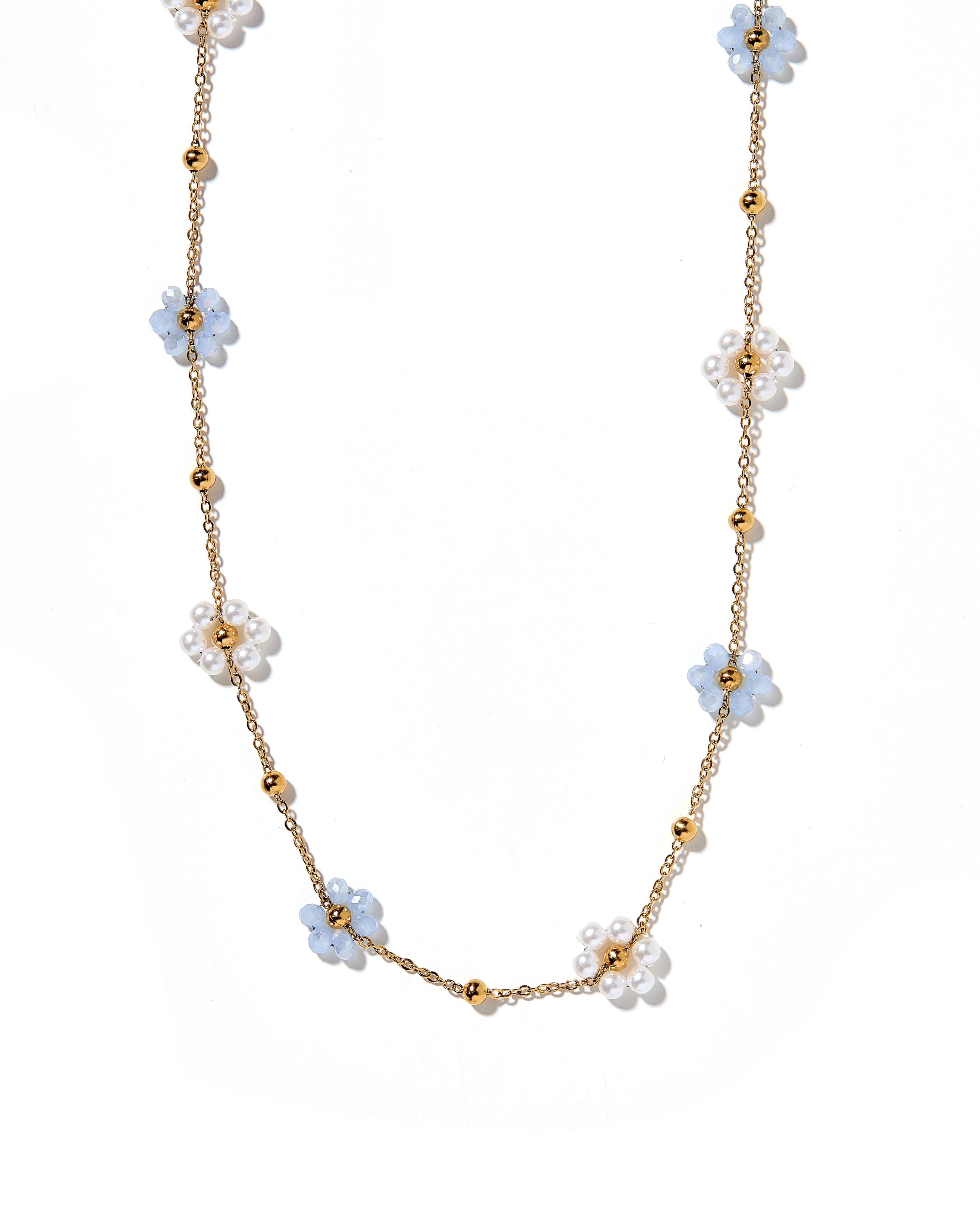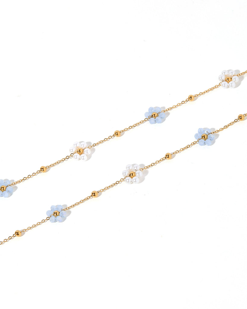 A necklace with a gold chain and pearl and blue flower accents.