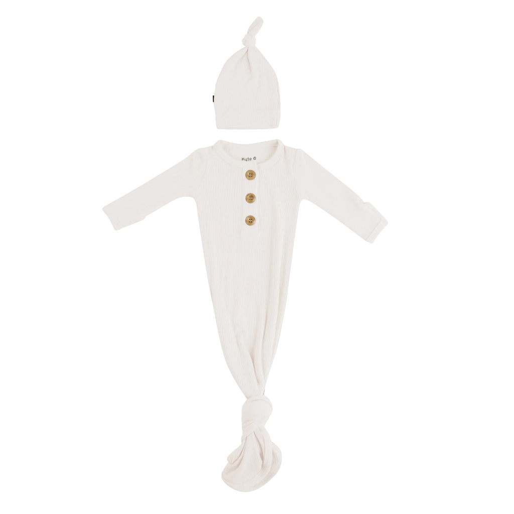 This all-in-one outfit is the softest newborn essential designed with both you and your baby in mind. Crafted from soft, stretchy ribbed bamboo, this gown features a tie bottom for easy diaper changes and comes with a knotted turban for the finishing touch to a classic look.