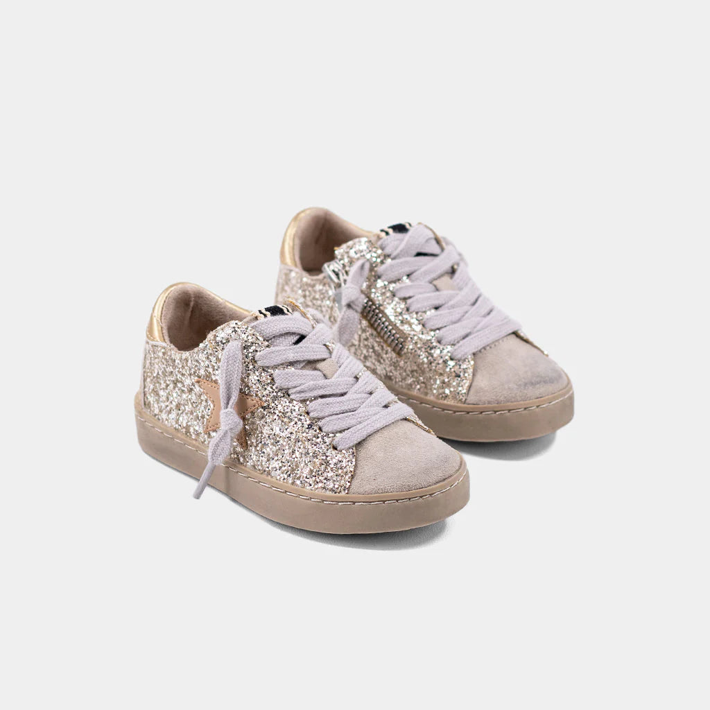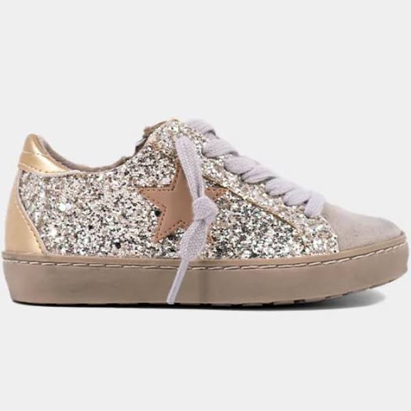 This pair features a unique combination of faux leather, suede, and mesh, giving them a distinctive look and feel. The glitter adds a pop of personality to any outfit, while the sturdy sole ensures they're comfortable for all-day wear.