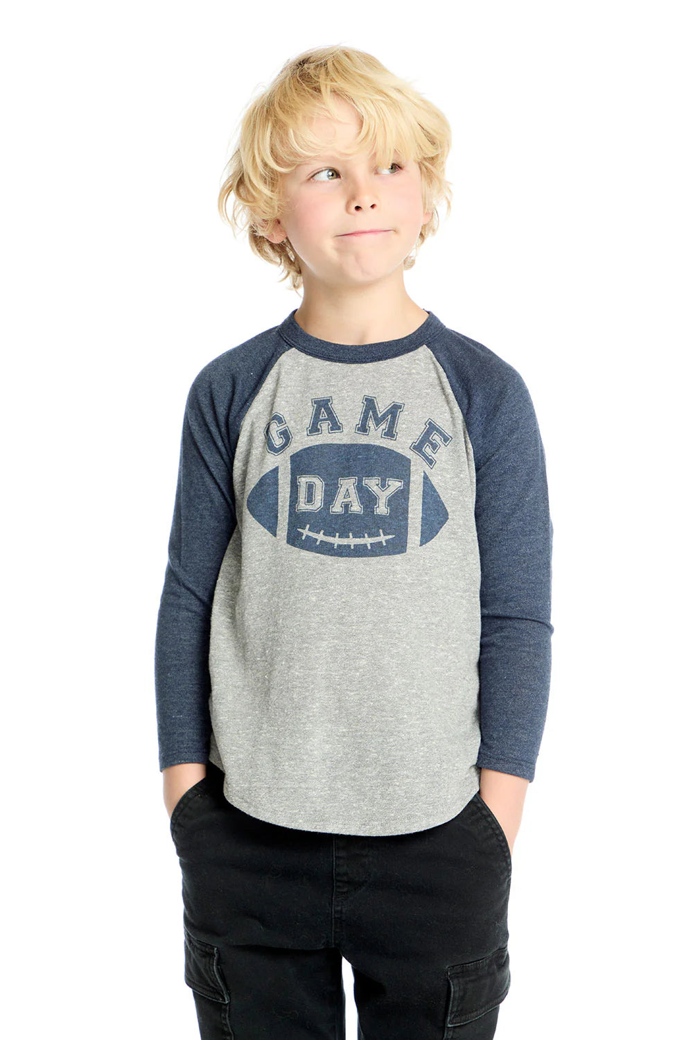 Featuring contrast colorblocked black sleeves, a soft grey body, and a bold black football graphic, this playful top is perfect for wearing on or off the field.