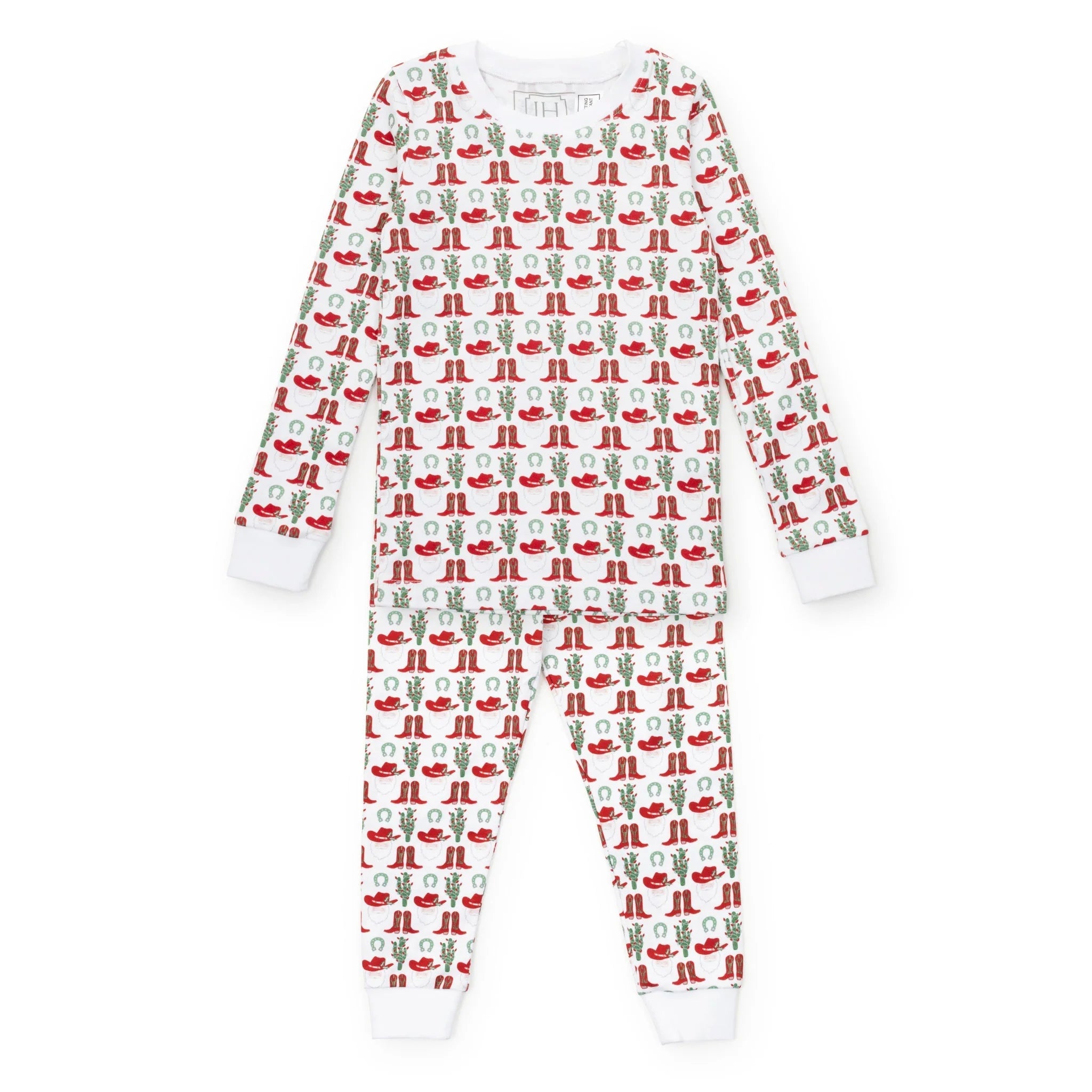 Pima cotton long sleeved pajama top and pant set. Pants have an elastic waistband. Made from 100% Peruvian Cotton. Our pajamas are designed with care and in compliance with CPSC safety standards. They are free from flame-retardant chemicals and are not flame resistant, so they are made to fit snugly.