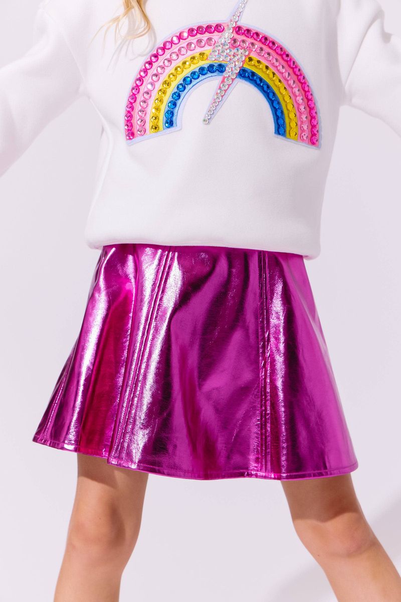 Bold and vibrant hot pink metallic skirt with a flared silhouette for a fun, statement-making look.