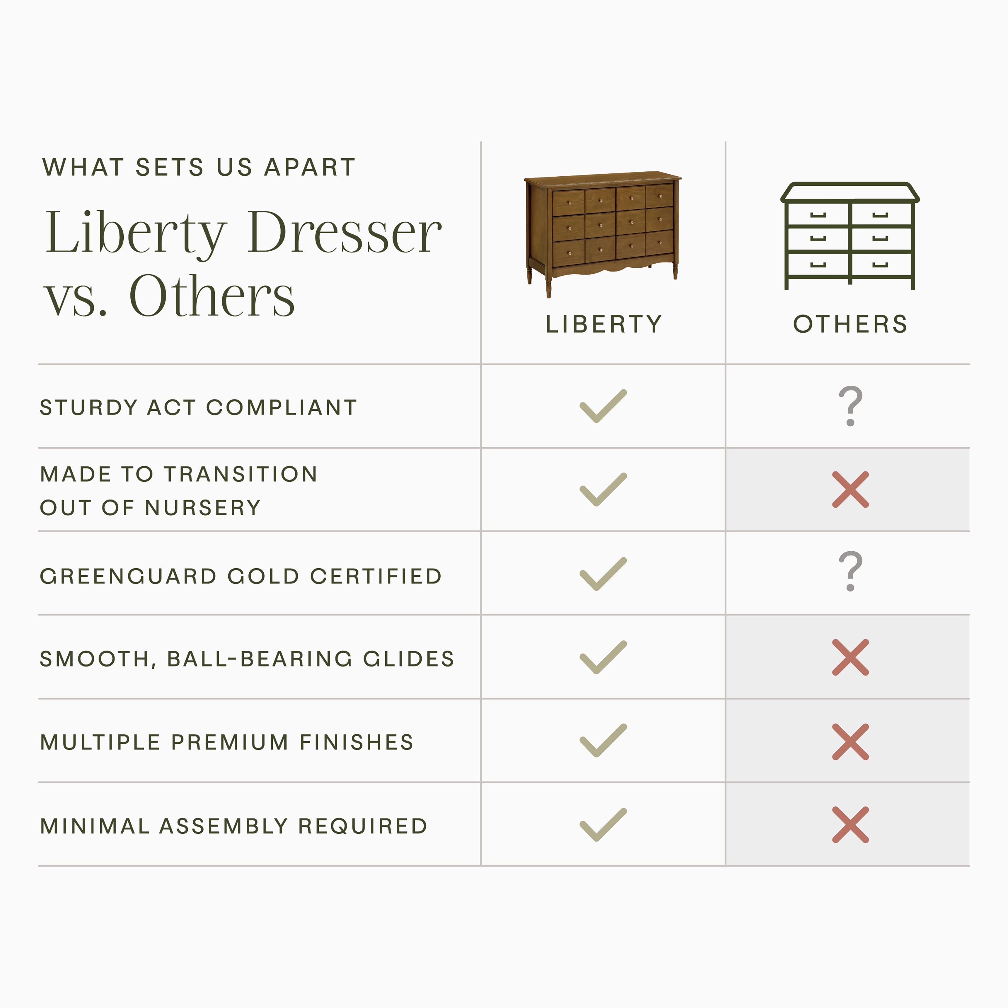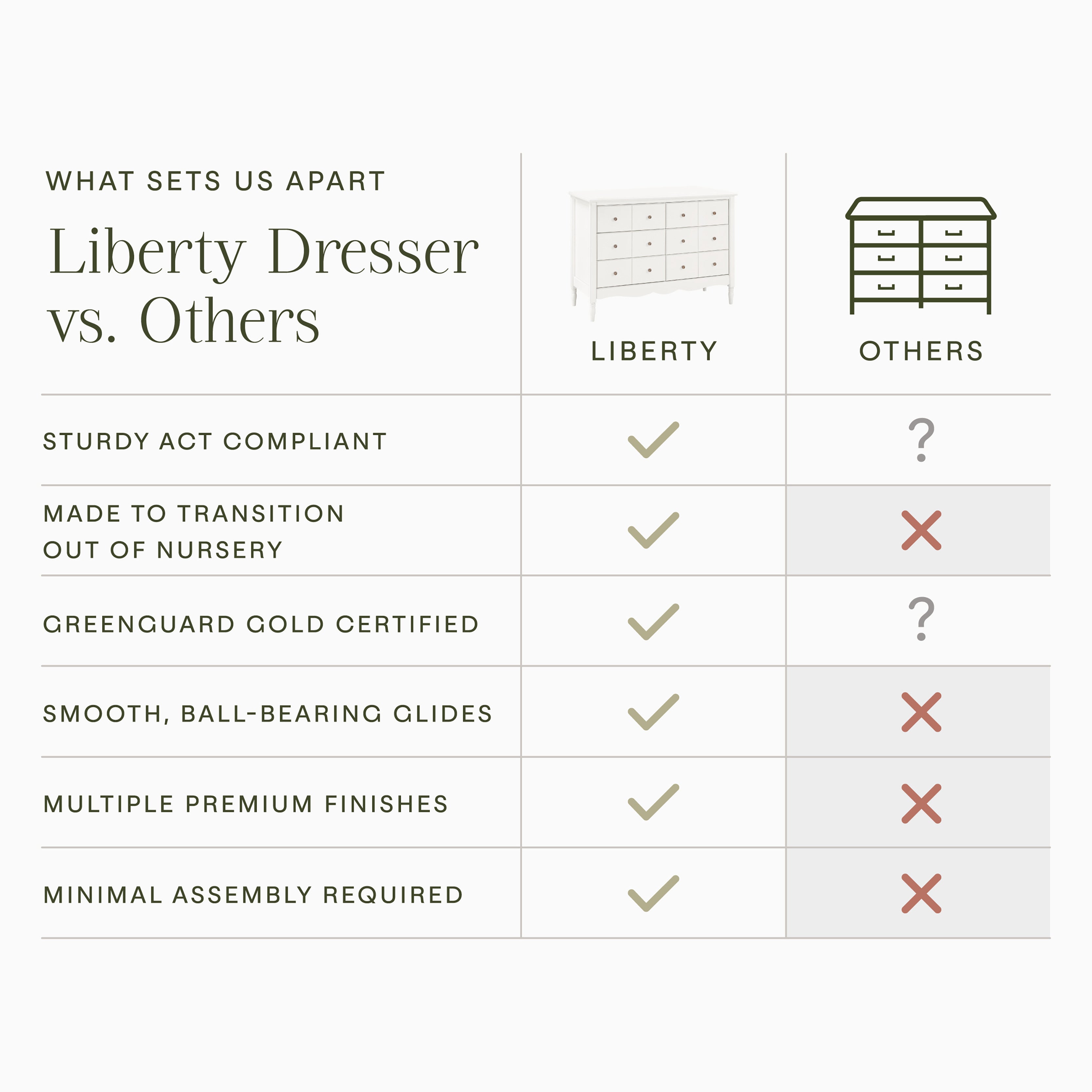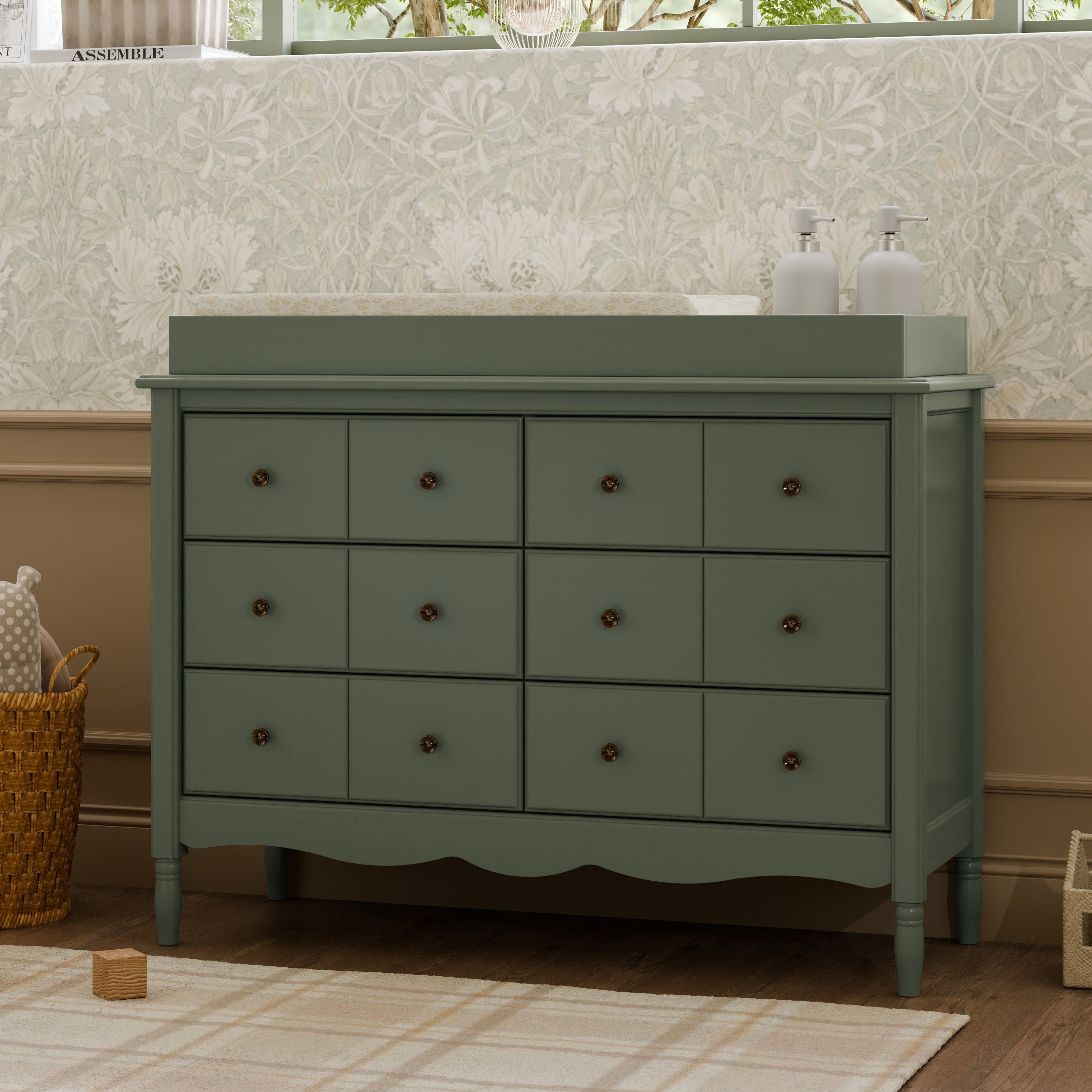 The vintage-inspired Liberty 6-Drawer Dresser is an elegant accent piece for any room. With apothecary style drawer fronts, tapered feet and scalloped apron, every detail has been thoughtfully designed. The Liberty dresser was made to pair with our best-selling Liberty, Abigail and Winston cribs.