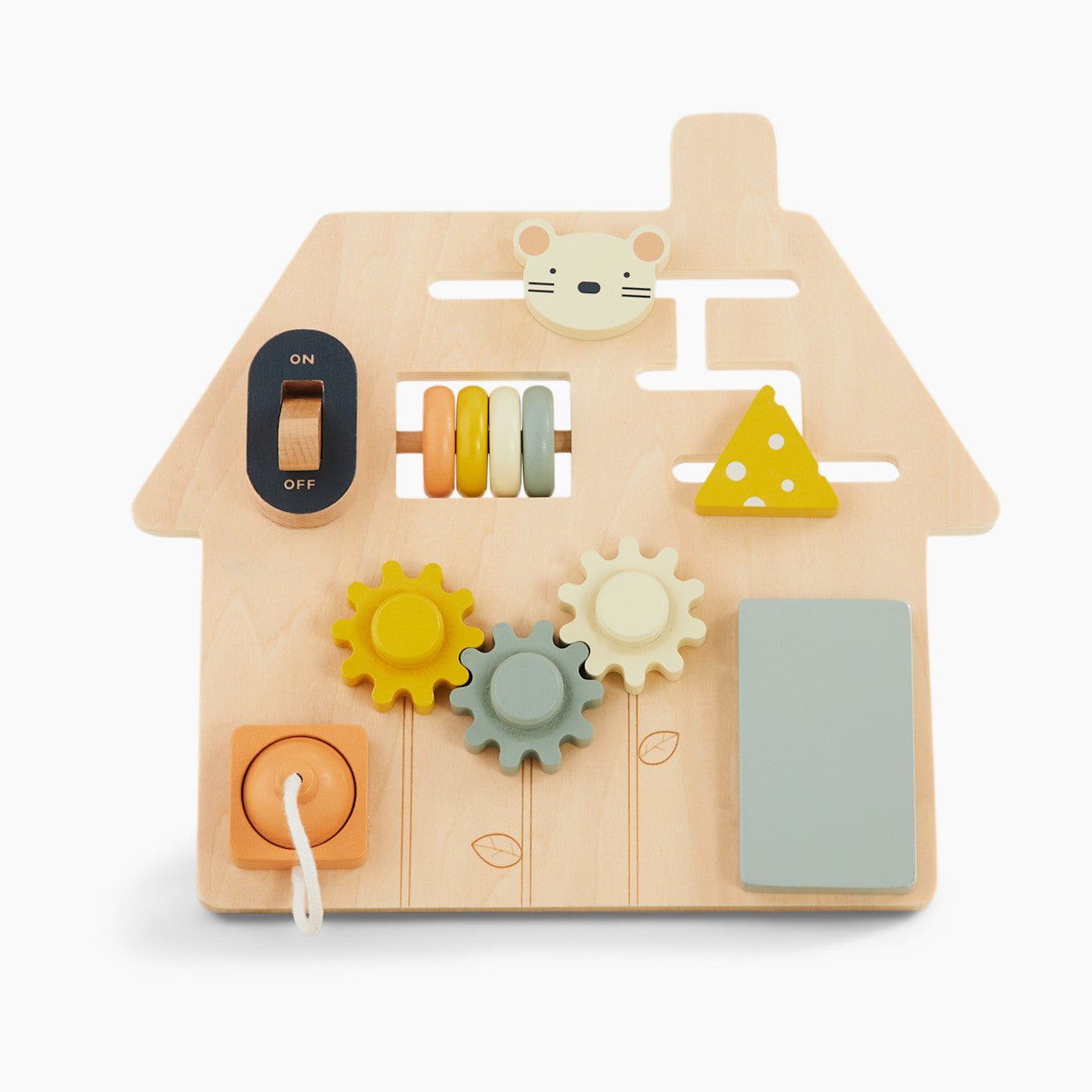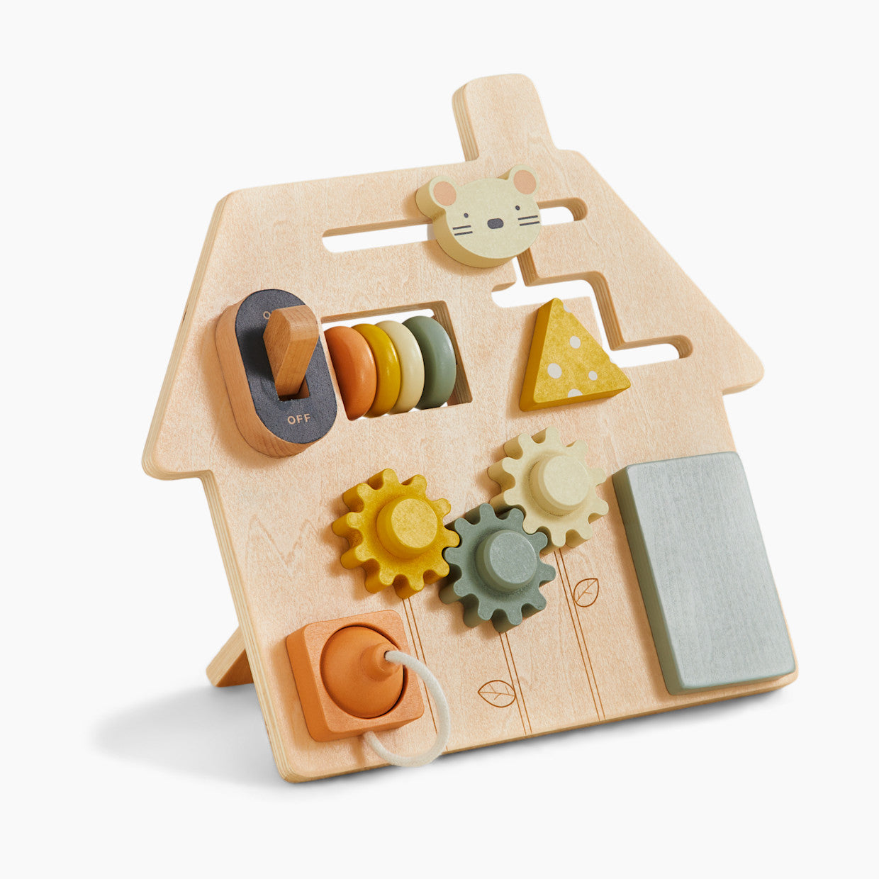 A compact design that’s great for travel, the wooden On-the Go Busy Board features a maze, abacus, peek-a-boo door with a surprise mirror inside, gears, switch and a three-prong plug. It can be played flat on the floor/table or be held up.