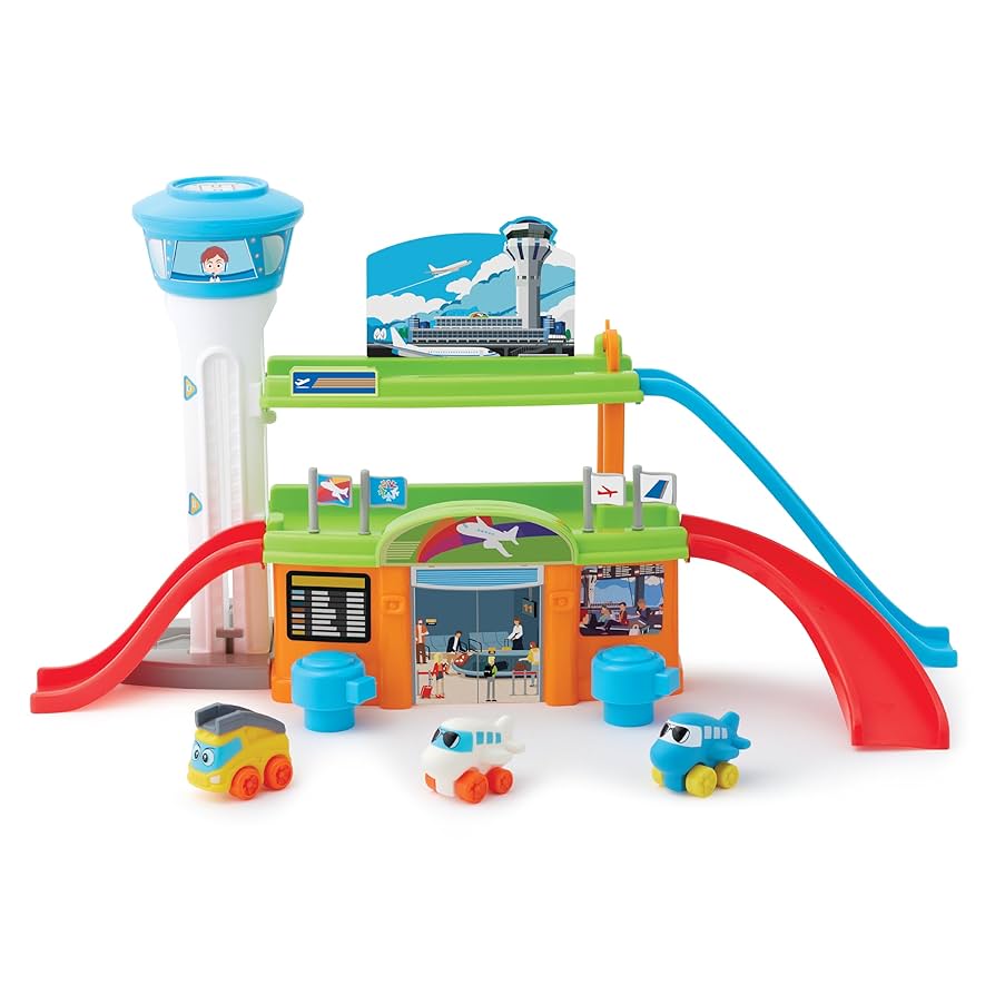 The Kidoozie Slide 'n Soar Airport Playset provides yout toddler with everything they need for a great adventure. The airport features multiple levels, a control tower, working elevator, vehicle sliding ramps, 2 airplanes and 1 airport truck. This airport offers multiple levels of play for your child to experience. Simply use the elevator to take your vehicle from the ground to the 1st level or all the way to the top floor. Each of the floors has gates that open & close as well as ramps that the vehicles can roll down. Engage your child's creativity with this realistic role play opportunity. Your child is control of the entire airport playset. From the planes to the truck to the control tower, there are so many different roles for them to play & enjoy. Package includes: 3 level airport with working elevator and 3 free-wheeling vehicles. Ages 12 months and up.