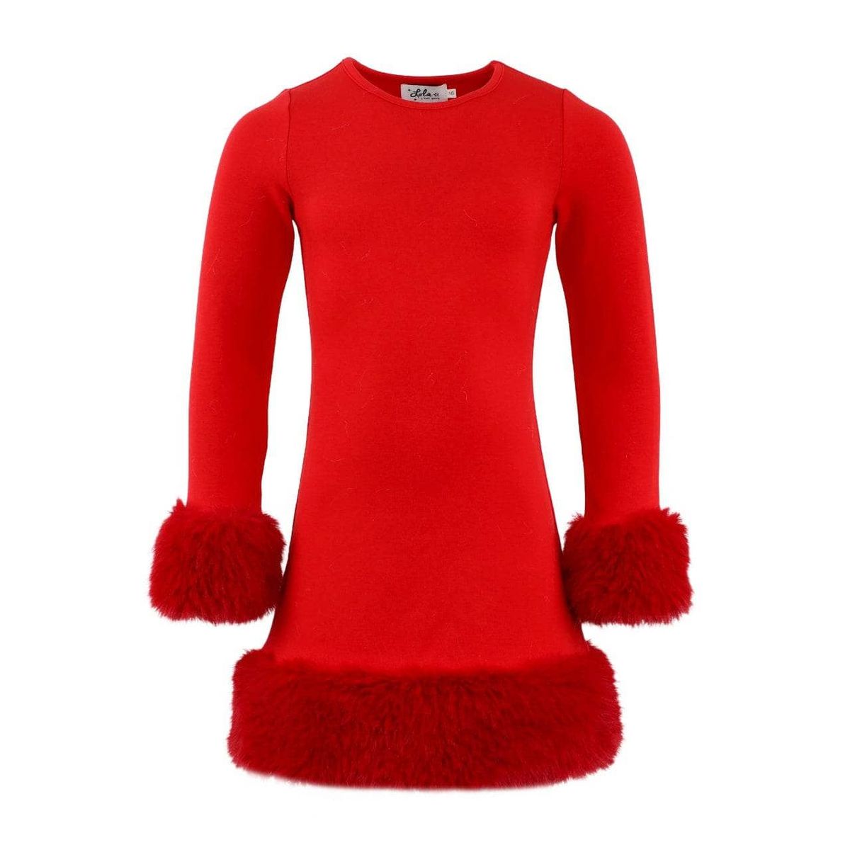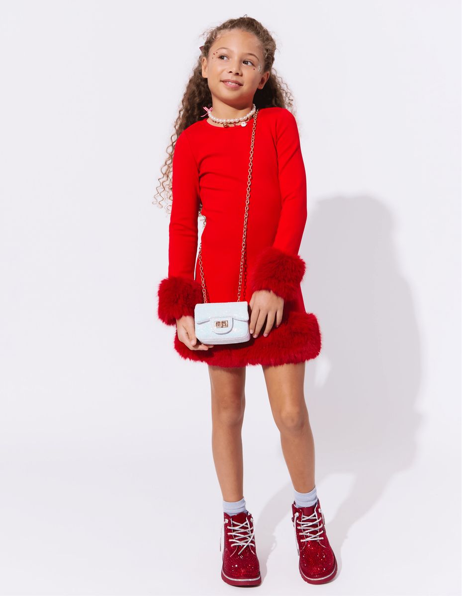 • This dress combines elegance with festive charm, featuring a bold red design adorned with plush faux fur trim on the cuffs and hem.