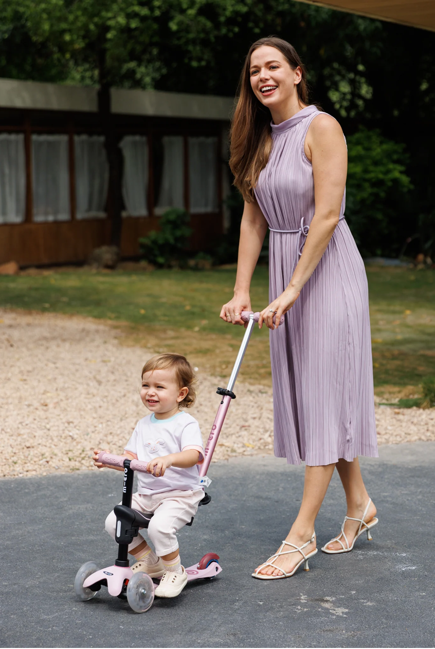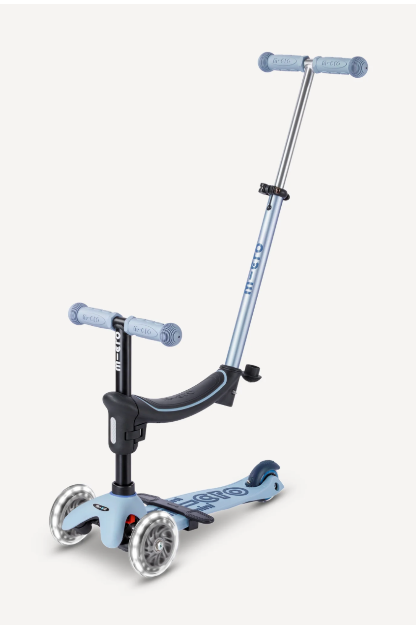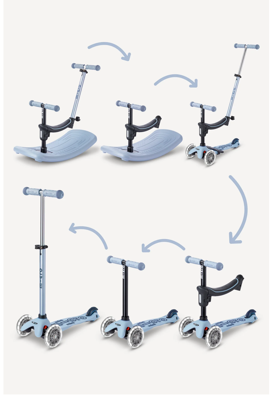 Stage 3: By moving the seat/T-bar combo to the Mini scooter base, kids can take their first ride on wheels—rolling forward while a parent provides support with the push bar.