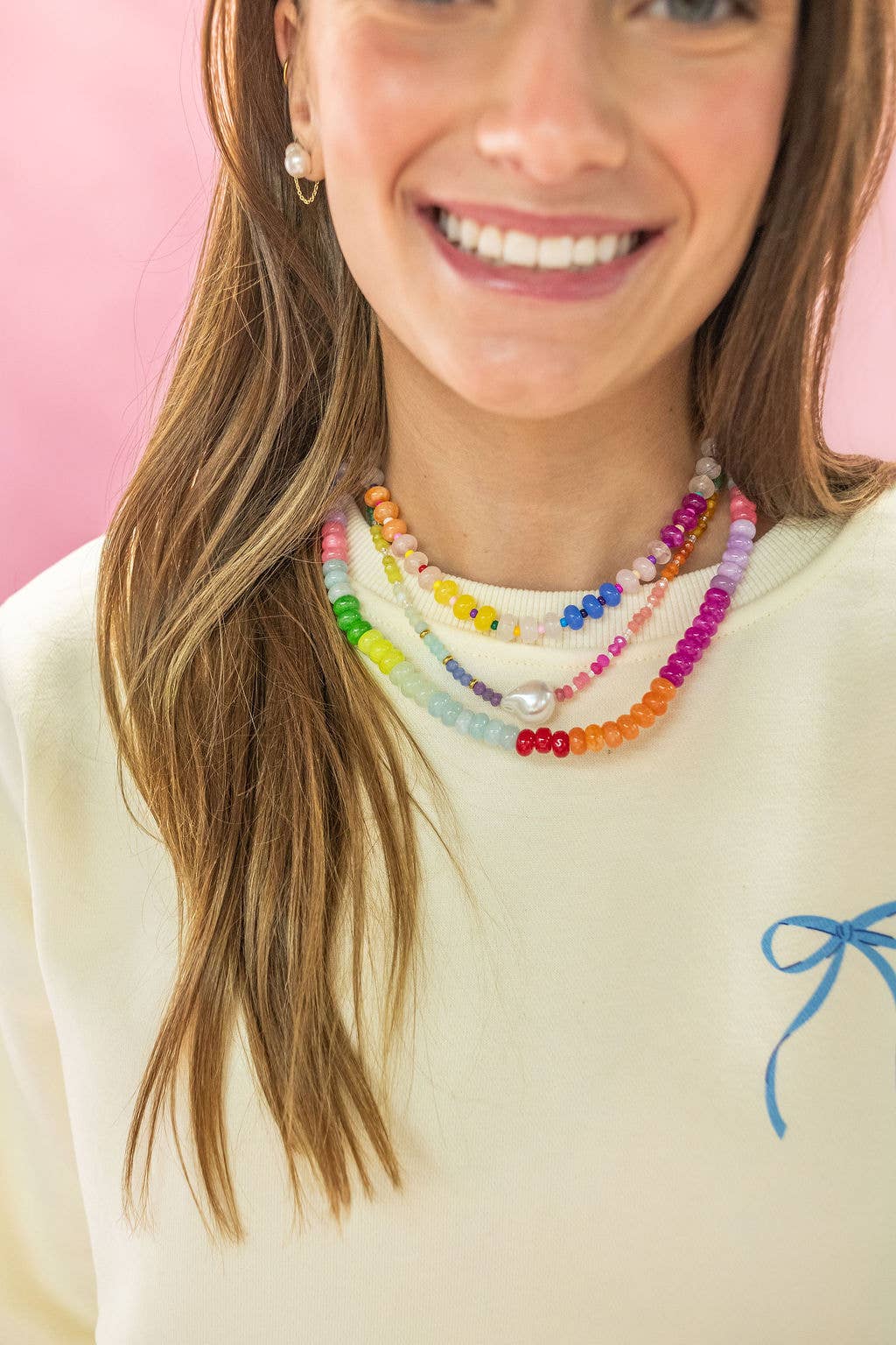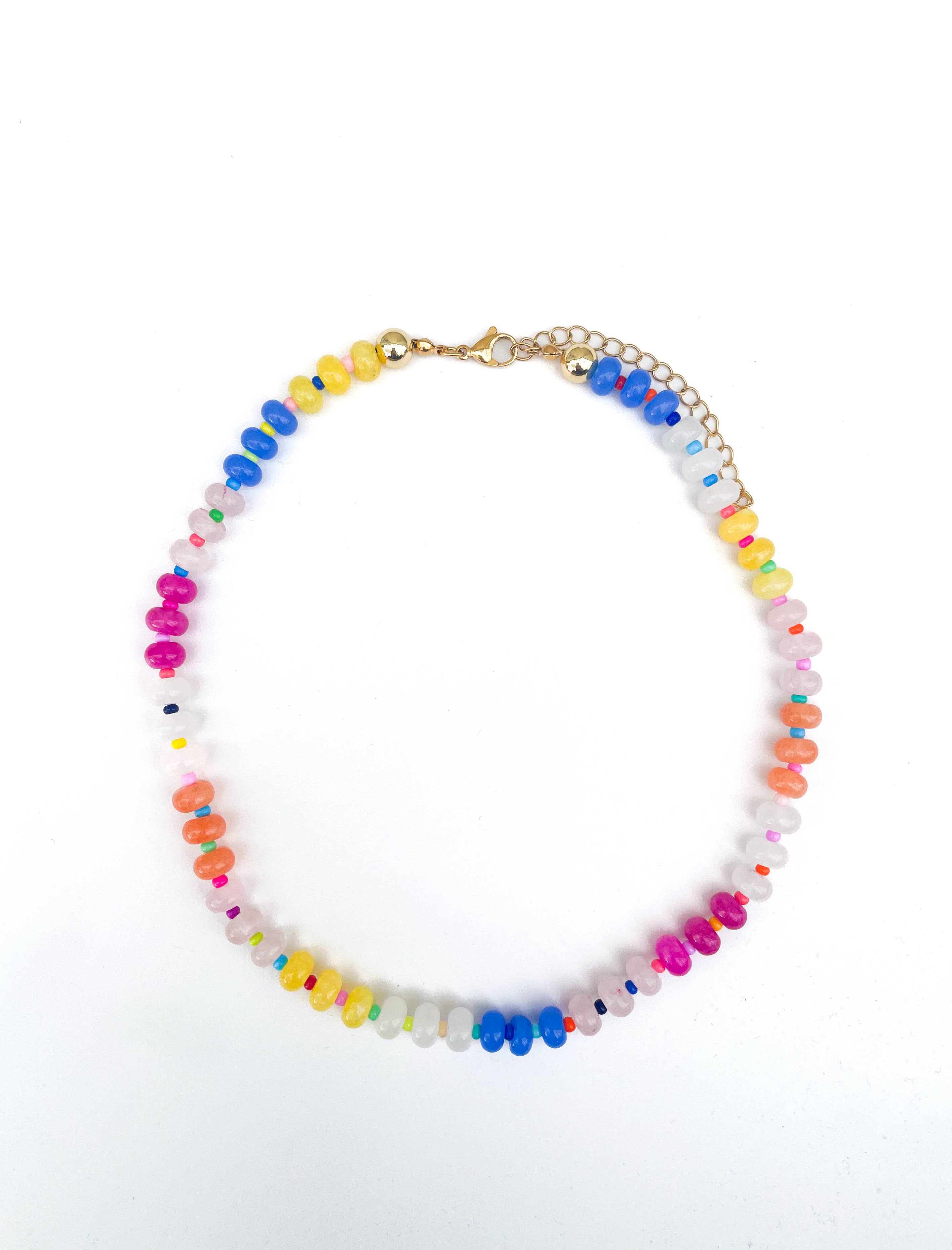 This adorable party loop rainbow necklace is a vibrant mix of gemstone beads. Each necklace features oval-shaped beads in various vibrant and pastel colors. The gemstones range from translucent to opaque and come in shades of cobalt, peach, fuchsia, yellow, soft pink, and white. Perfect for adding a touch of color and charm to any outfit! 16" necklace with 3" extension.