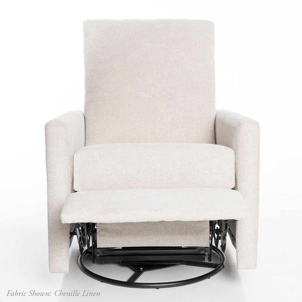 Our exclusive Drew gliding swivel Nursery Recliner does everything: it reclines, rotates, plus it has a parallel rocking motion that gently glides, so you easily turn toward anything you might need to reach.