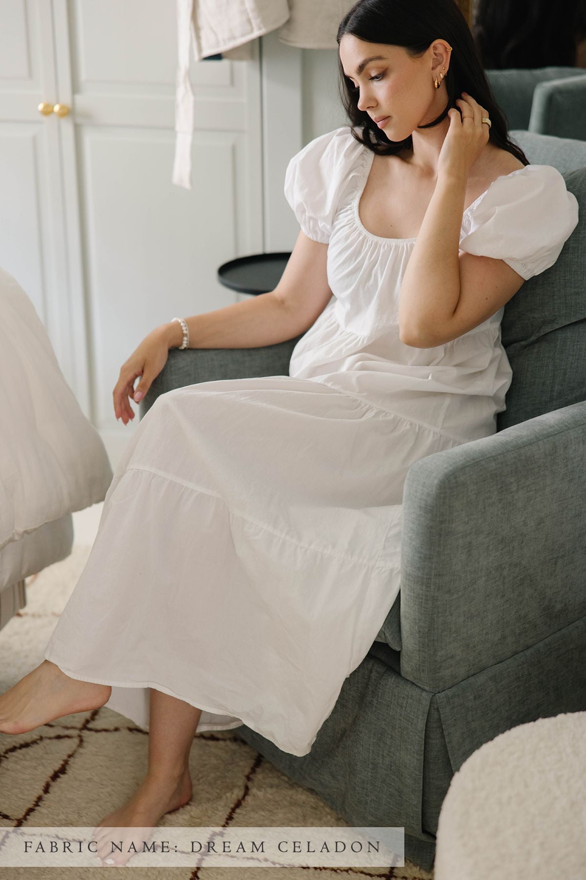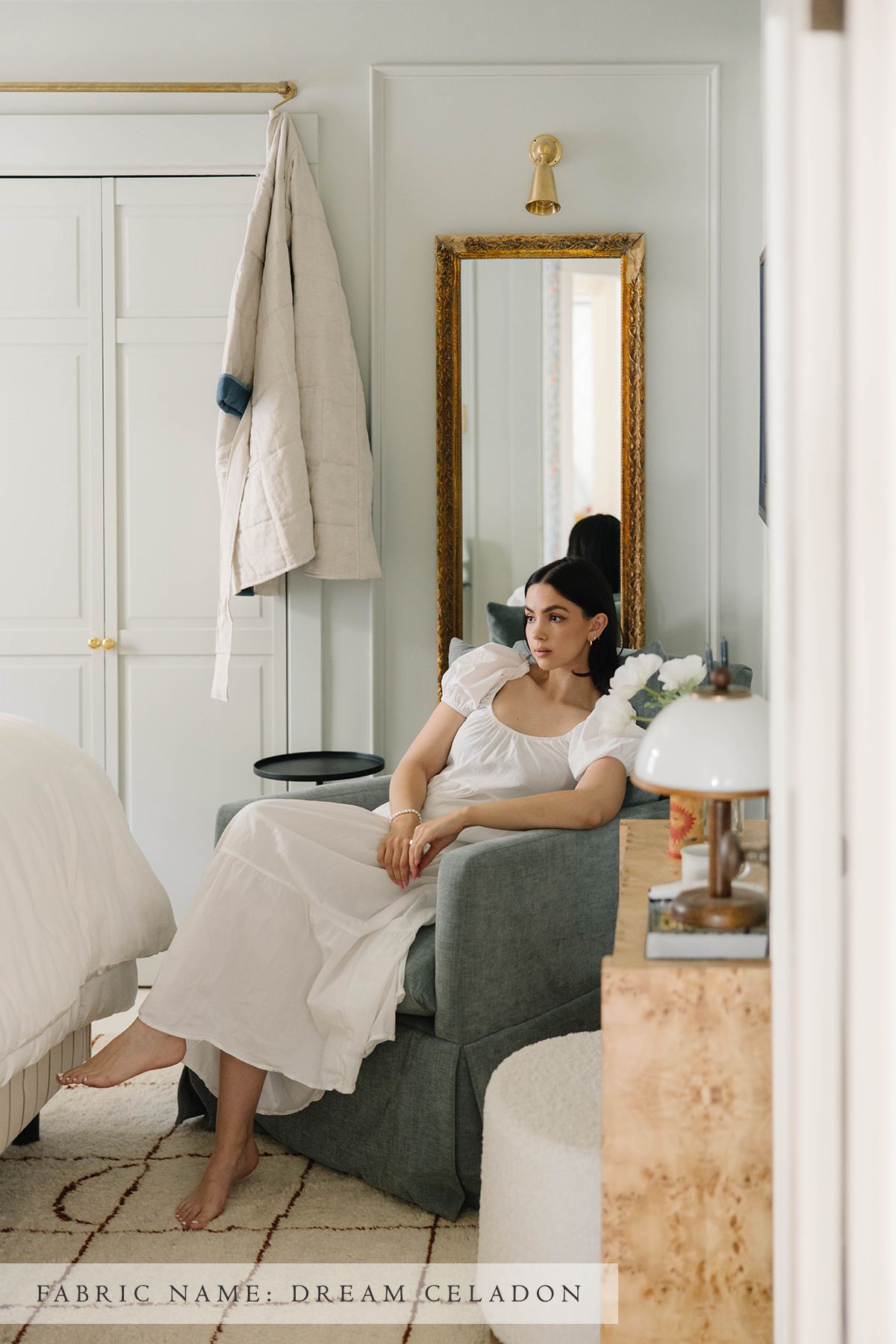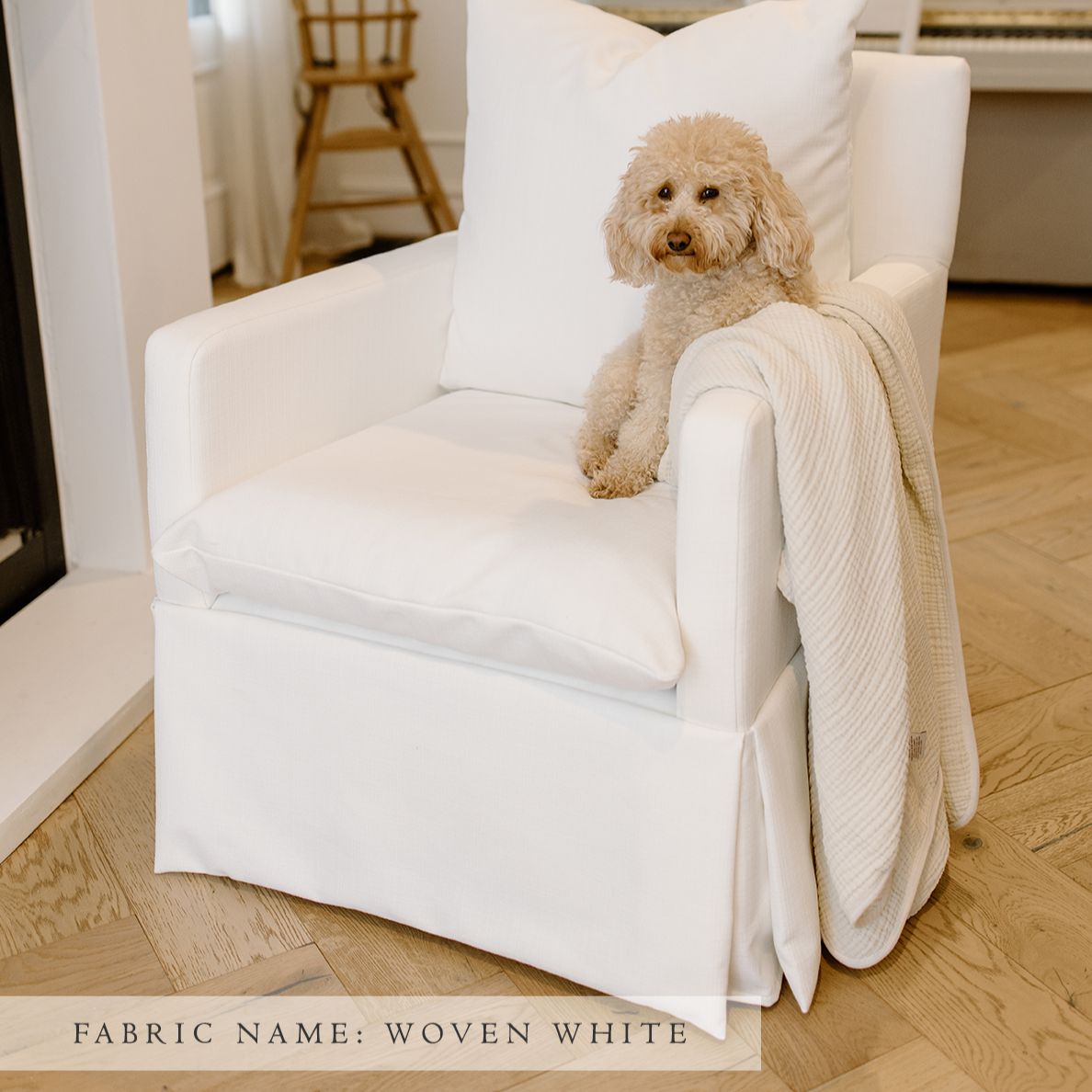 The Zoey glider features a skirted glider base, with removable down cushions that allow you to sink into the chair to find your perfect spot. Embrace style, comfort, and sophistication!