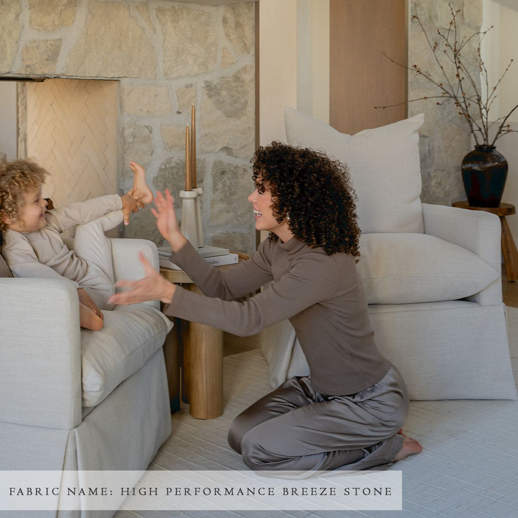 Our exclusive Zoey Swivel Nursery Glider has a full 360º swivel motion and parallel rocking motion that gently glides, so you easily turn towards anything you might need to reach.