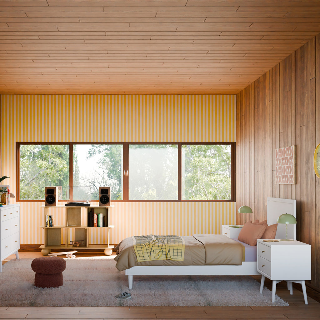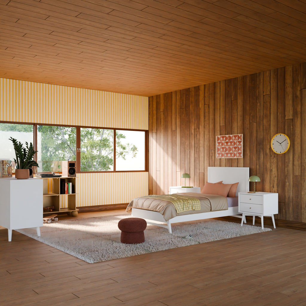 The Palma Nightstand with USB port and is a sophisticated mid-century inspired design with tapered legs, brushed metal hardware, and two smooth-glide drawers. Easy setup with minimal assembly required.