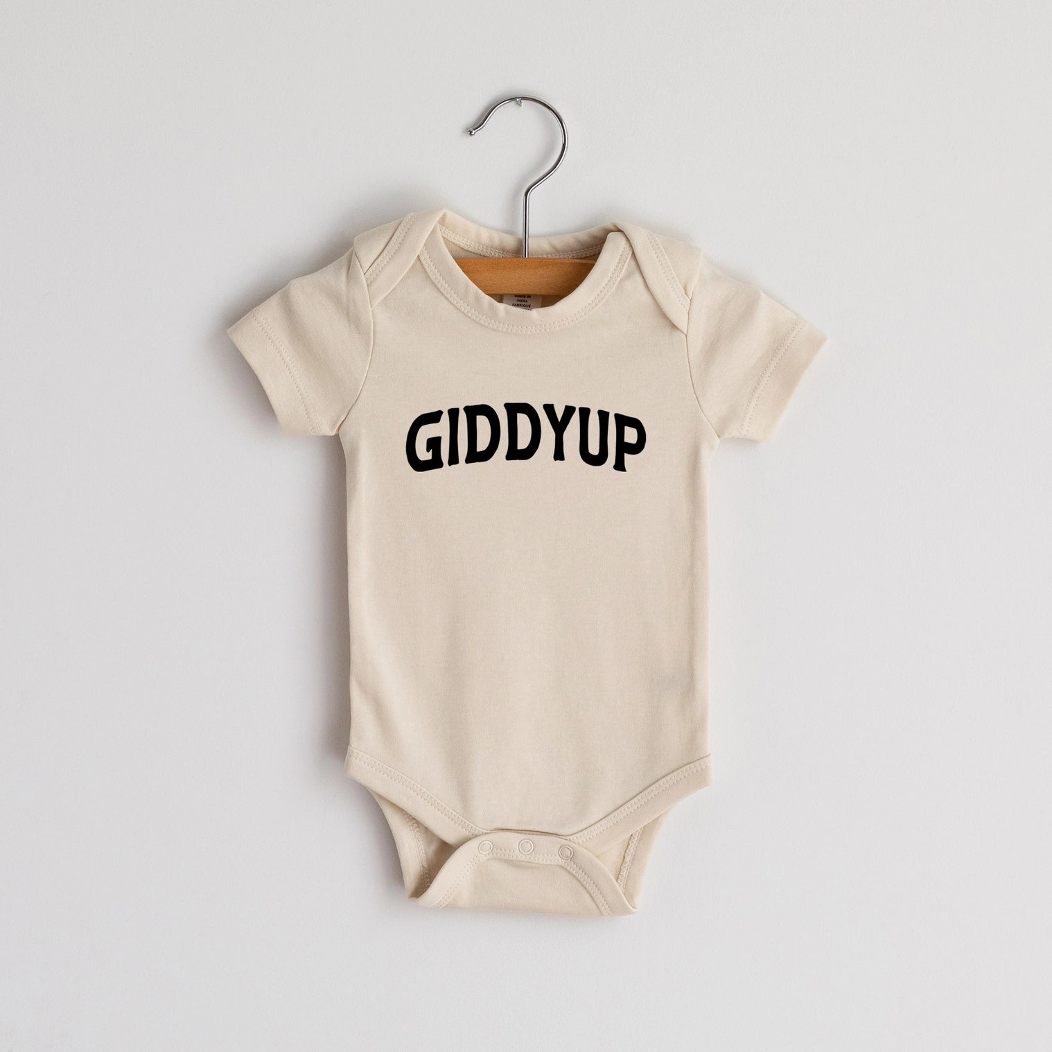 "Giddyup" • Wrap them up in Southern charm! This super-soft, 100% organic cotton outfit features modern script typography in crisp white ink on a luxe camel colored bodysuit - designed with love and screen printed in-house. Perfect for a baby's first introduction to the world!
