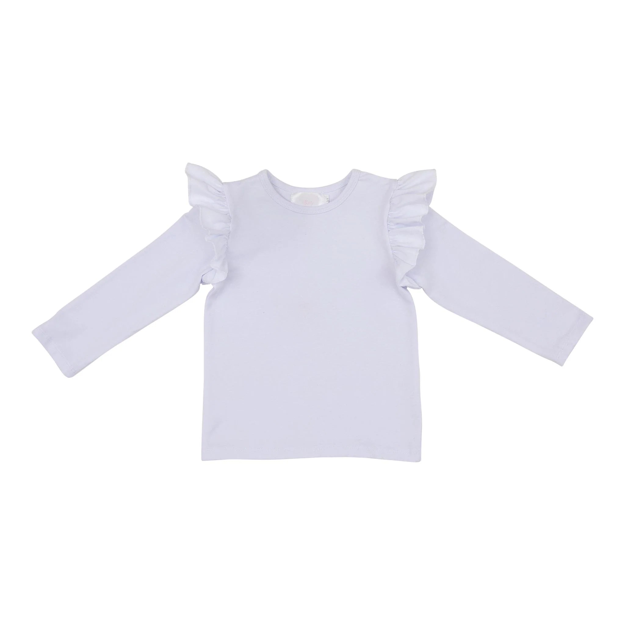 Our solid ruffle tee is a favorite to pair with printed twirl skirts, leggings, or layered under a pinafore!