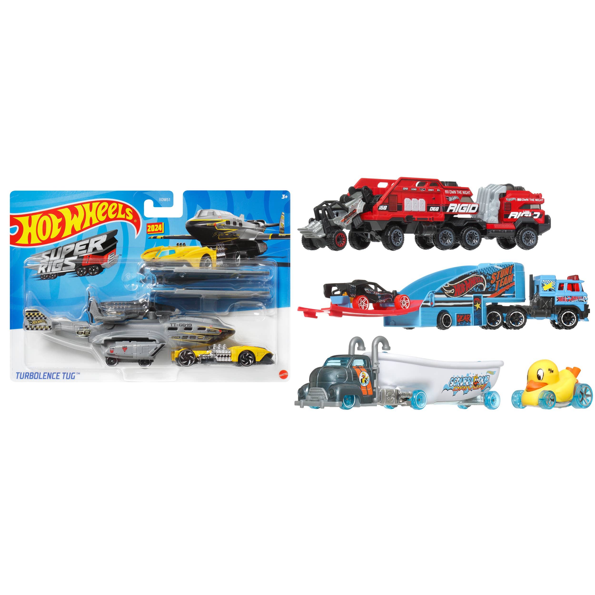 Each rig comes with a sports car and dynamic detailing. Push around, load and go or hit the track for racing thrills. Ages 3Y+.