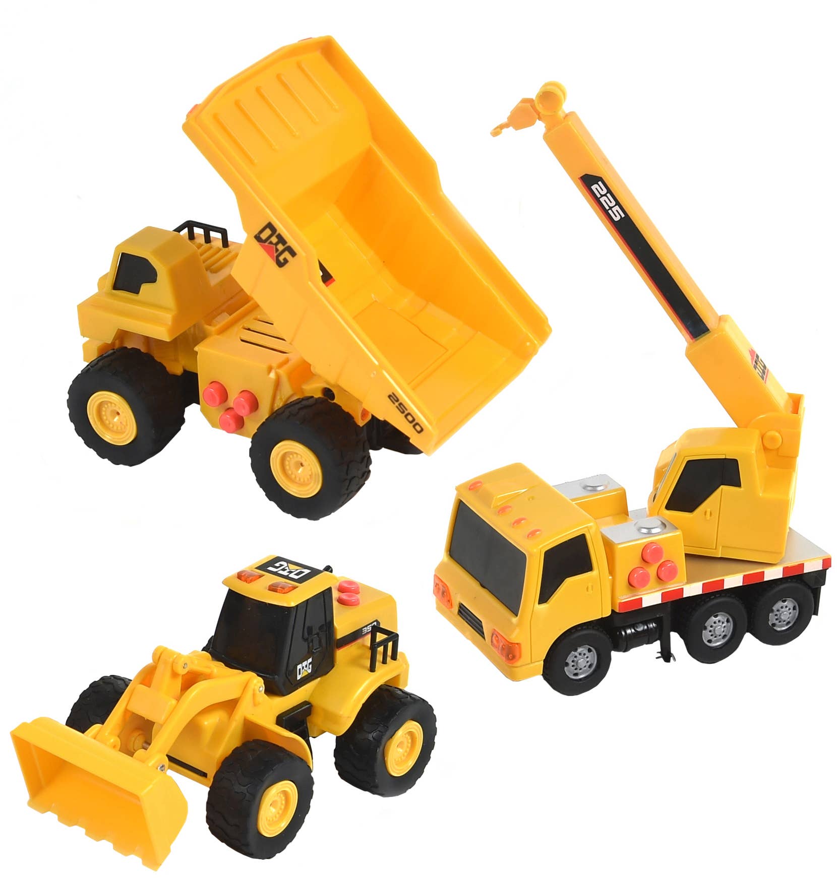 Friction motor. LED lights and sounds. Moving parts. Rubber tires. Assortment includes Crane Truck, Loader and Dump Truck. 3 Pack in one playset.