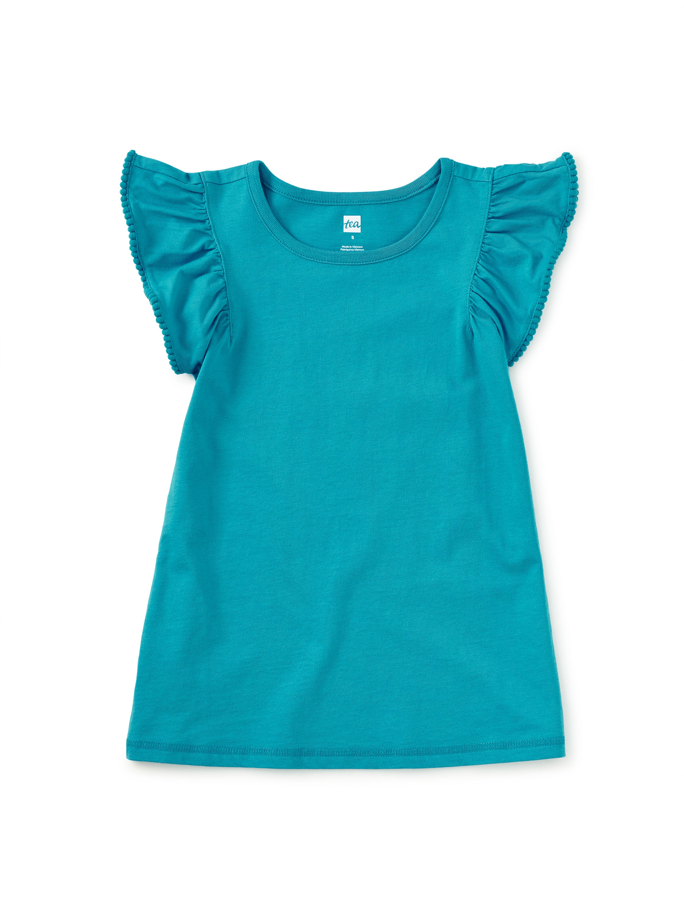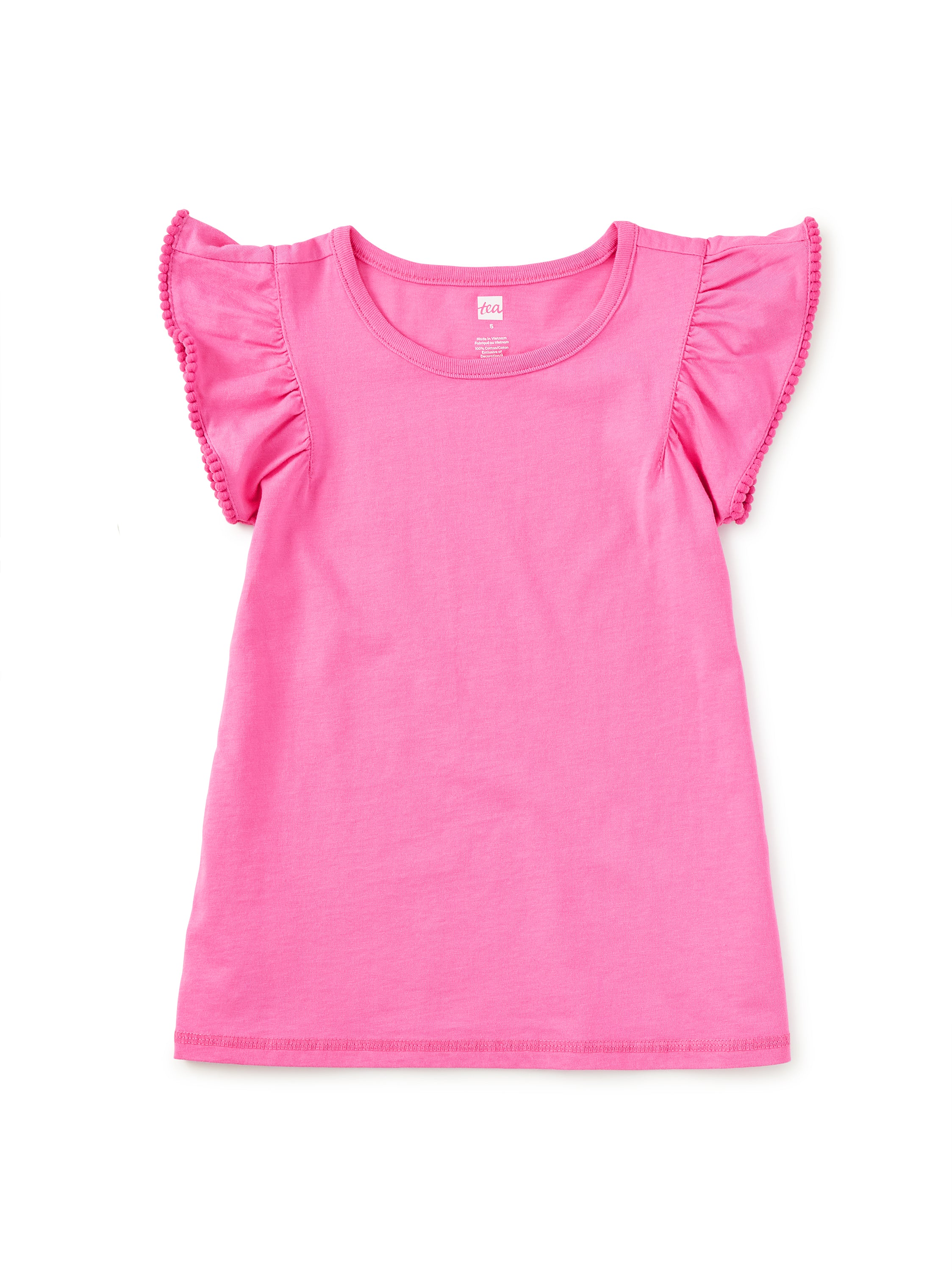 Soft cotton jersey meets playful detail in this easy, everyday top. Featuring fluttery ruffle sleeves trimmed with pom-poms and a classic crew neckline, it's comfy enough for all-day wear and cute enough for any plan.