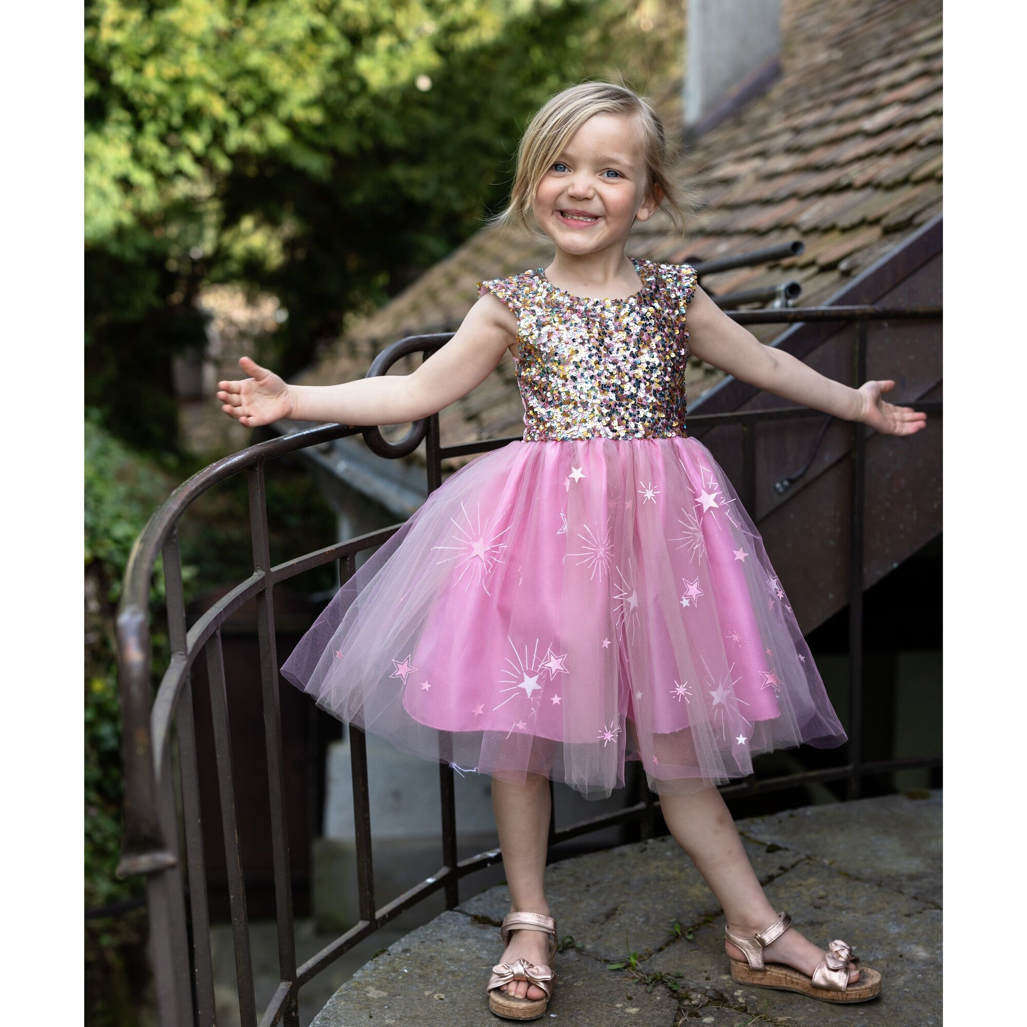 Great Pretenders A Star is Born Sequins Dress is a magical mix of sparkle and starry charm! This show-stopping dress features a vibrant sequin bodice in a stunning blend of pink, blue, gold, and silver sequins that glimmer and shine with every move, perfect for shining on a stage or lighting up the room at any celebration! The back side is stretchy and the elasticized waistband allow for comfort and size flexibility. Flowing from the glittering top is a dreamy pink tulle skirt, adorned with shimmering pink stars that add a touch of whimsy and wonder. The soft, layered tulle sways beautifully with every twirl, making it just right for dress-up days, birthdays, or simply feeling fabulous! With a comfortable fit and easy pull-on style, the A Star is Born Dress is made for little stars who love to sparkle!
