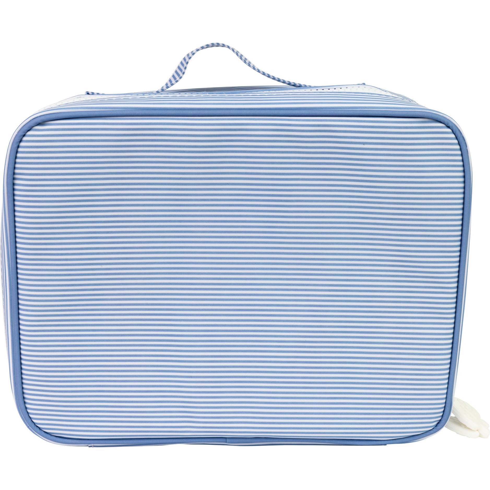 Coated, clean, and cute! It is just the right size for your bento box. Equipped with a mesh inner pocket to hold your cooler packs and love notes, specifically placed on the back of the lunchbox leaving the front open for monogramming.