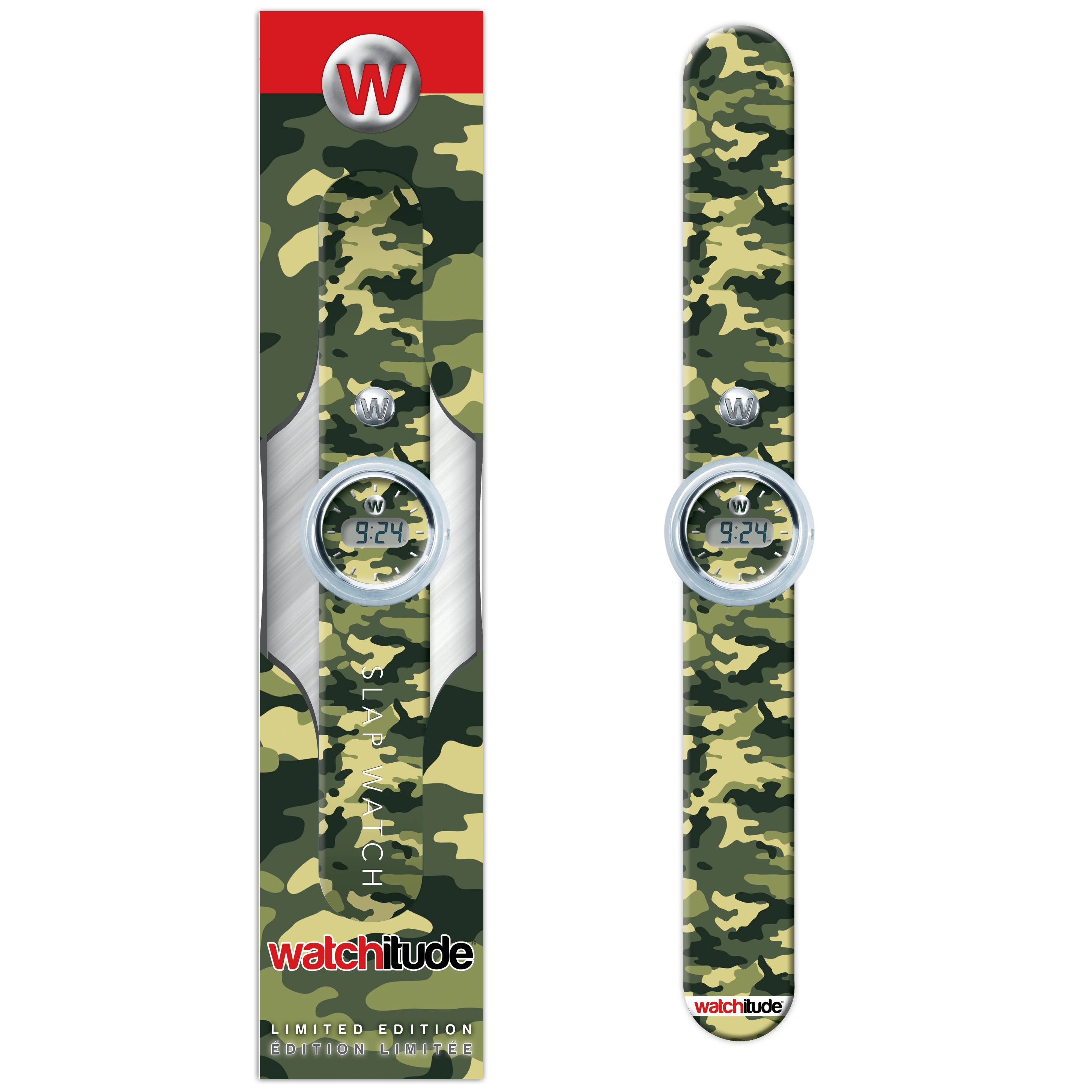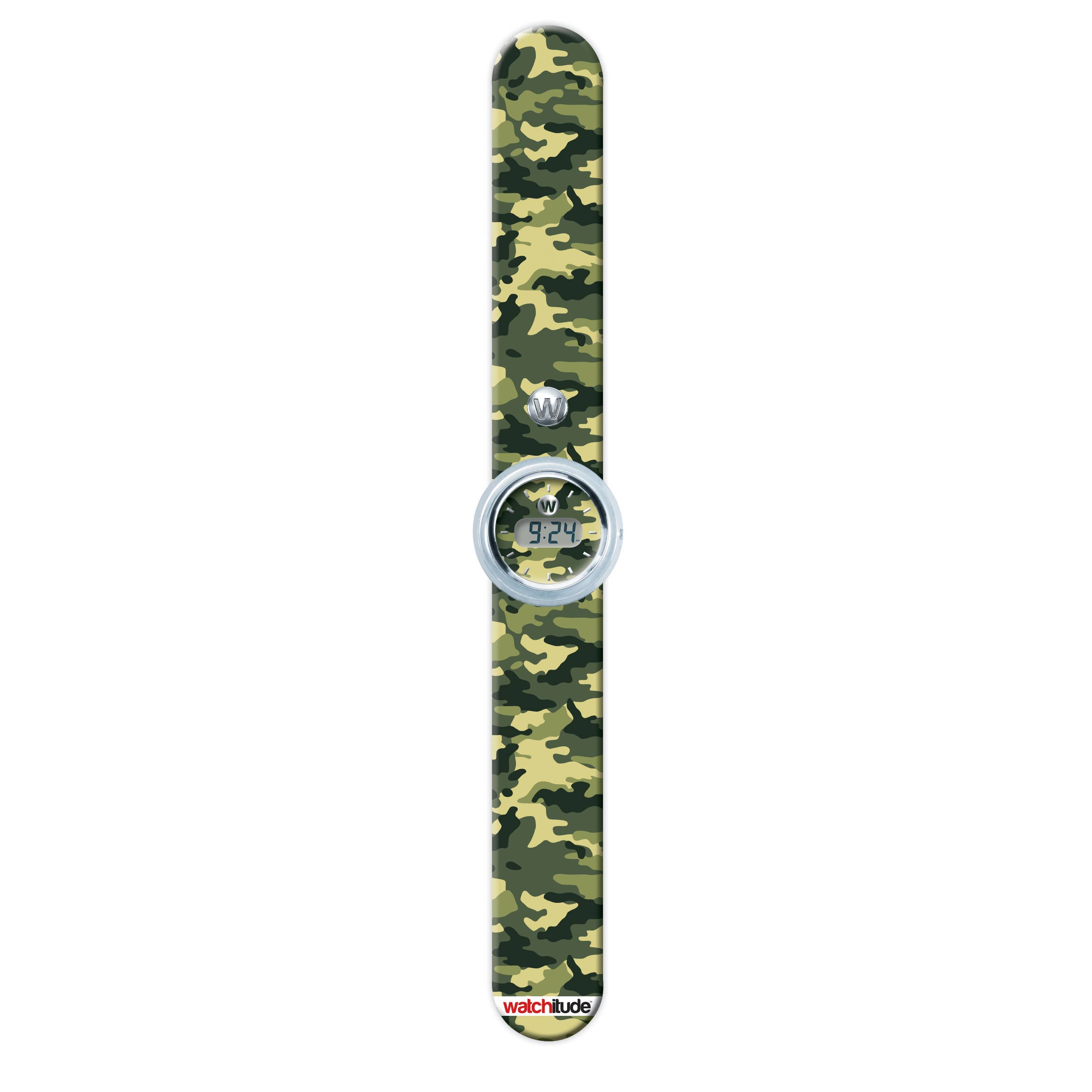 Blend into adventure with the Army Camo Watchitude Digital Slap Watch, a tactical style digital timepiece perfect for outdoor loving kids ages 4 to 12. This plunge proof watch combines military inspired camouflage design with easy to read digital display and Watchitude's signature slap band technology. The removable watch face slides off the band, allowing kids to mix and match with over 150 Watchitude designs, trade with friends, and build a collectible bracelet wardrobe that matches any outfit or activity.