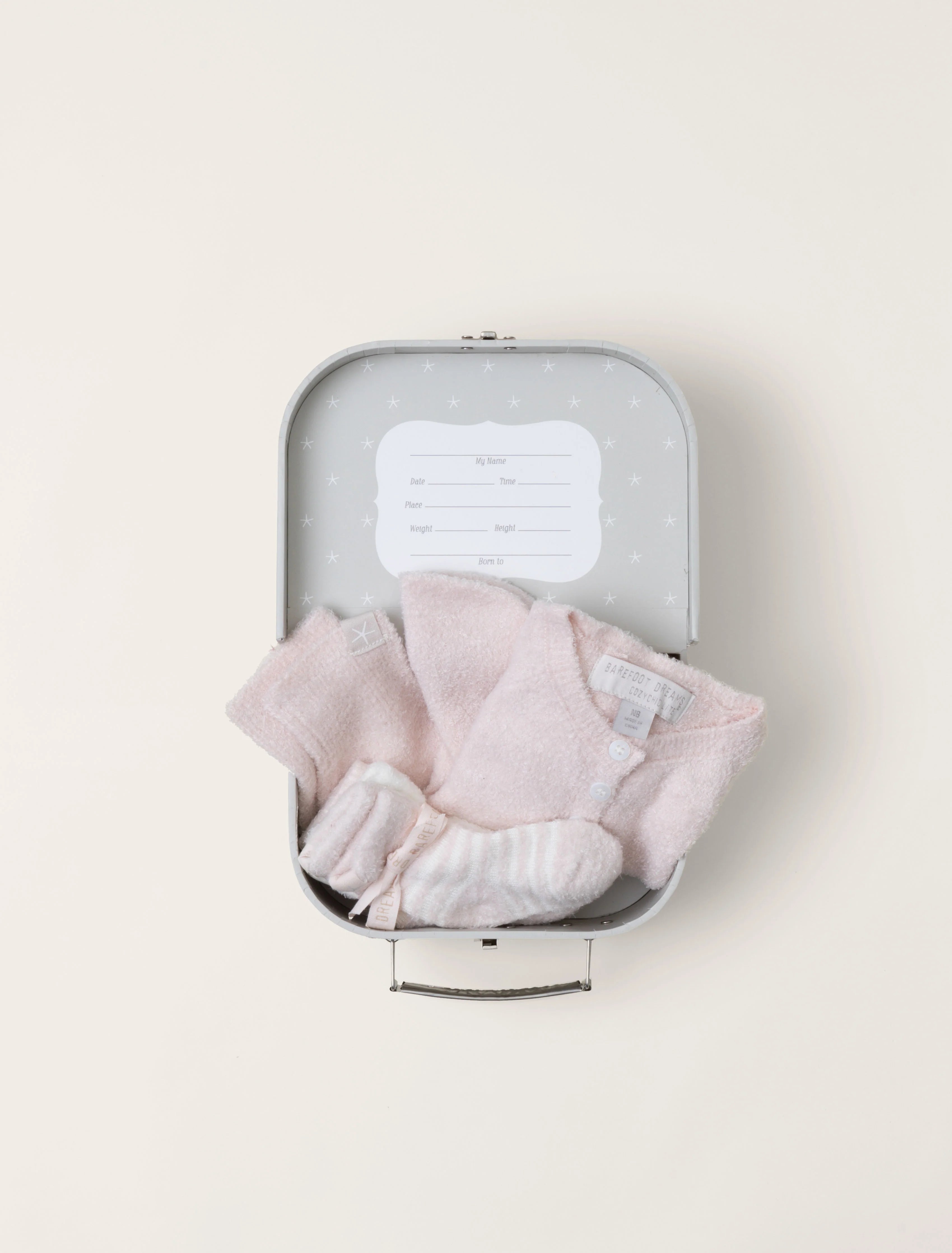 Coming home from the hospital just got sweeter with our Heirloom Newborn Set. This is every newborn's must have when it comes to being enveloped in super soft, luxurious coziness for their first trip home. Each suitcase ensemble includes a CozyChic Lite cardigan, pull on pant, beanie and three pairs of socks. The suitcase doubles as the perfect keepsake box that details important info; Name, Date, Time, Place, Height, Weight and Born to.