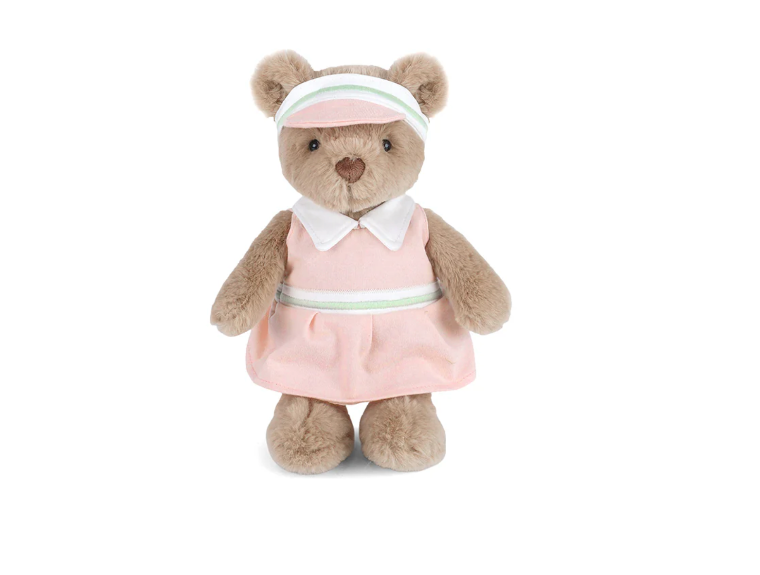 Say hello to Birdie Golf Bear, the sweetest little golfer on the green! Dressed to a “tee” in her pastel pink dress with a crisp white collar and matching visor, she’s ready to chase sunshine and swing into fun. Her soft caramel fur and smile make her as huggable as she is sporty. Whether she’s practicing her putt or sipping lemonade at the clubhouse, Birdie brings a touch of teddy elegance to every fairway adventure!