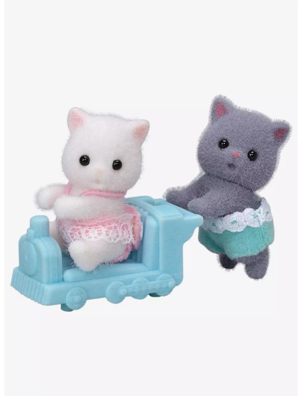 Persian Cat Twins comes with two Persian Cat babies (one sitting, another crawling) and a ride-on toy. The figures' heads can move. The ride-on toy fits either of the Persian Cat Twins.Persian Cat Twins have fluffy fur. The sitting twin is a girl, who likes tracing grooves on buildings and furniture with her paws. The crawling twin is a boy, who loves rides, so he plays with the ride-on toy more than anyone.
