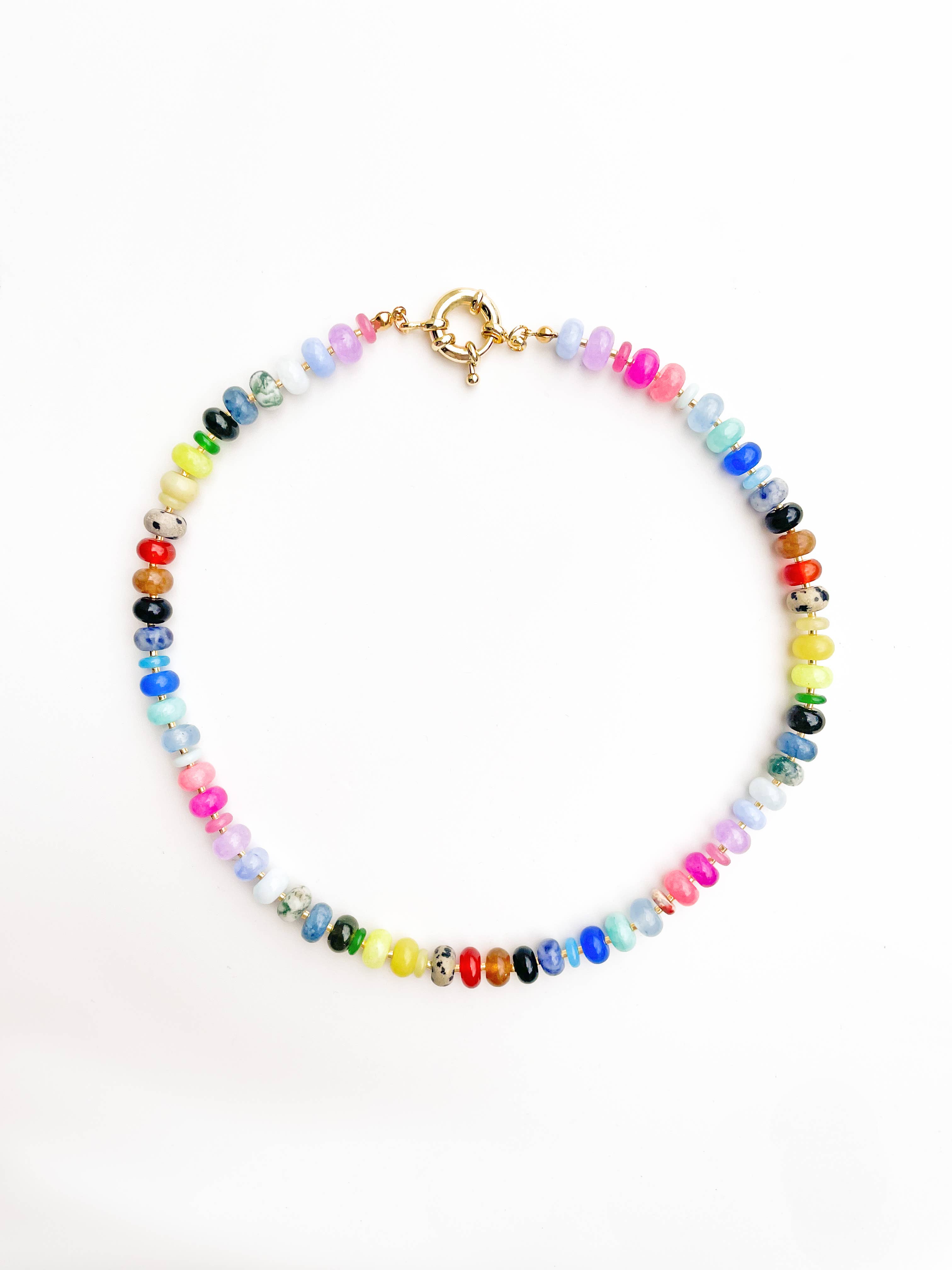 Beaded, gemstone, rainbow, jewelry, statement necklace, multicolor, trendy, vibrant, trending, colorful,