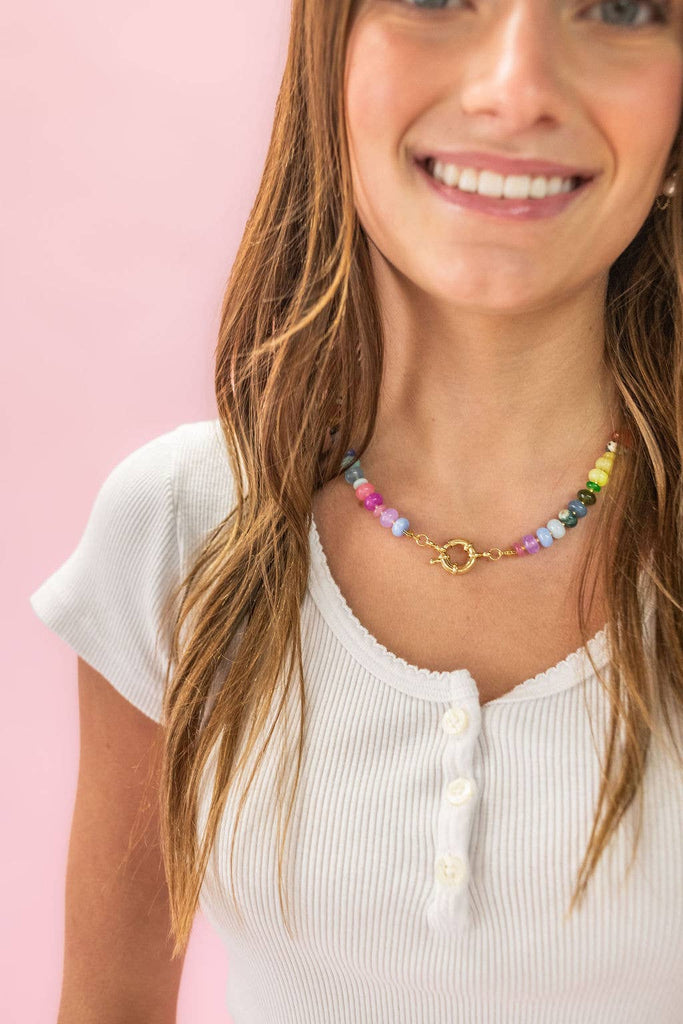 This adorable rock candy necklace is a vibrant mix of gemstone beads. Each necklace features small oval-shaped beads in various vibrant and pastel colors. The gemstones range from translucent to opaque and come in rainbow shades of cobalt, peach, fuchsia, yellow, green, mint, soft pink, and white. Perfect for adding a touch of color and charm to any outfit!