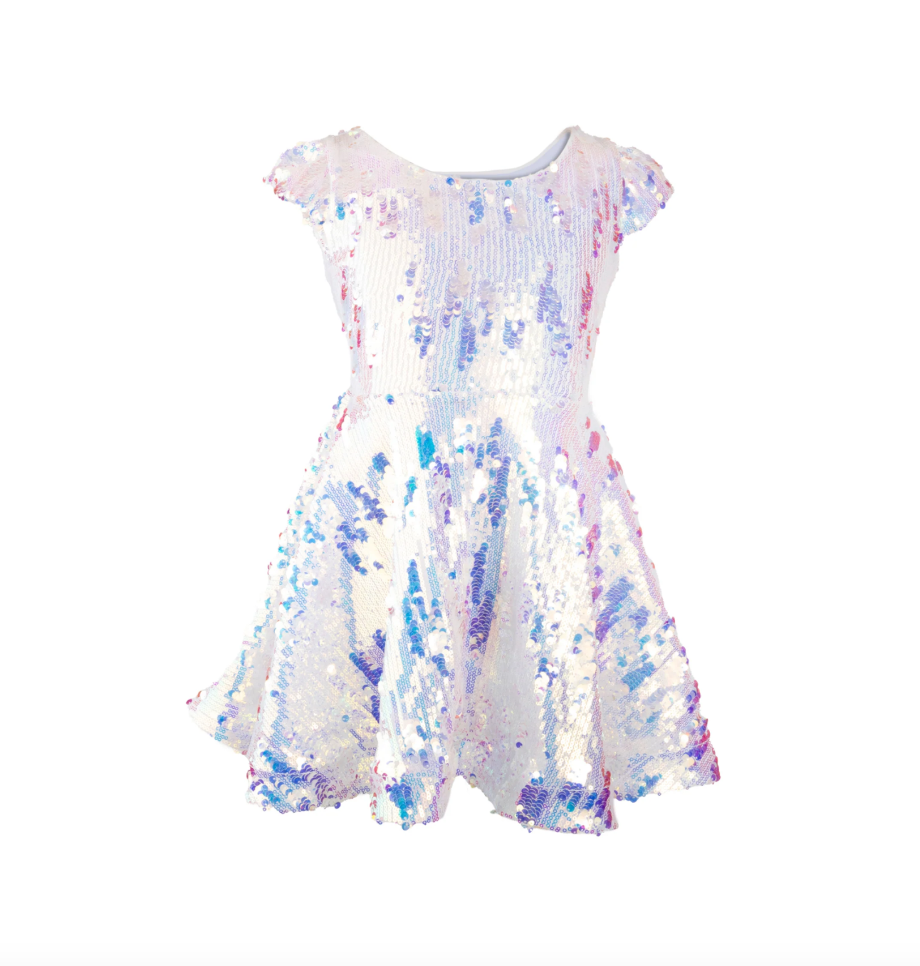 Get ready to sparkle like a true superstar in the Sequins Concert Queen Dress! Inspired by the energy and glam of a sold out show, this dress is made for rising stars who love to shine. Covered in a mix of large and small iridescent sequins, the dress glows white at first glance, but reflects soft purples and rainbow hues as it moves—just like the dazzling lights of a live performance.