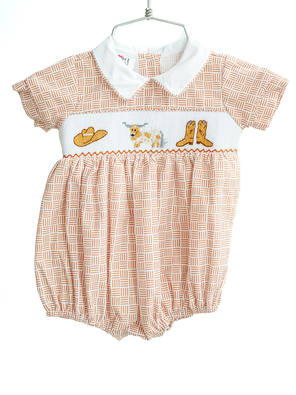 Your little football fan will look adorable in our Smocked Boy's Bubble! Made from a soft and durable blend of 65% polyester and 35% cotton, this smocked collared bubble features a charming design.