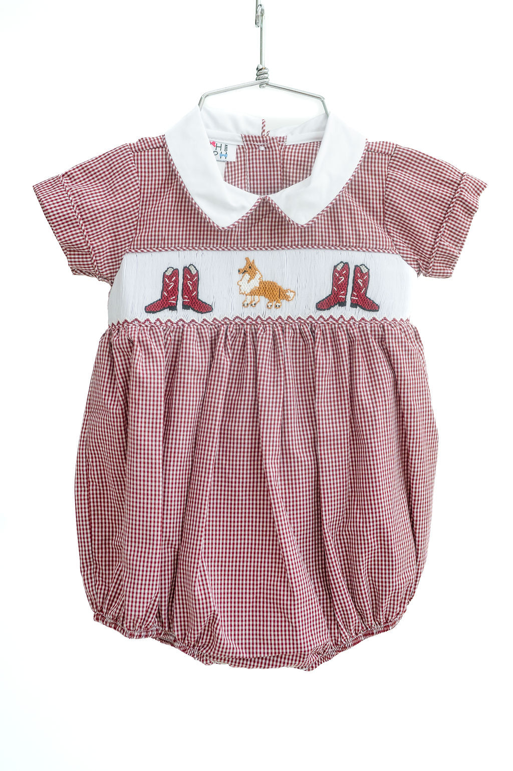- Smocked collared bubble with embroidered design