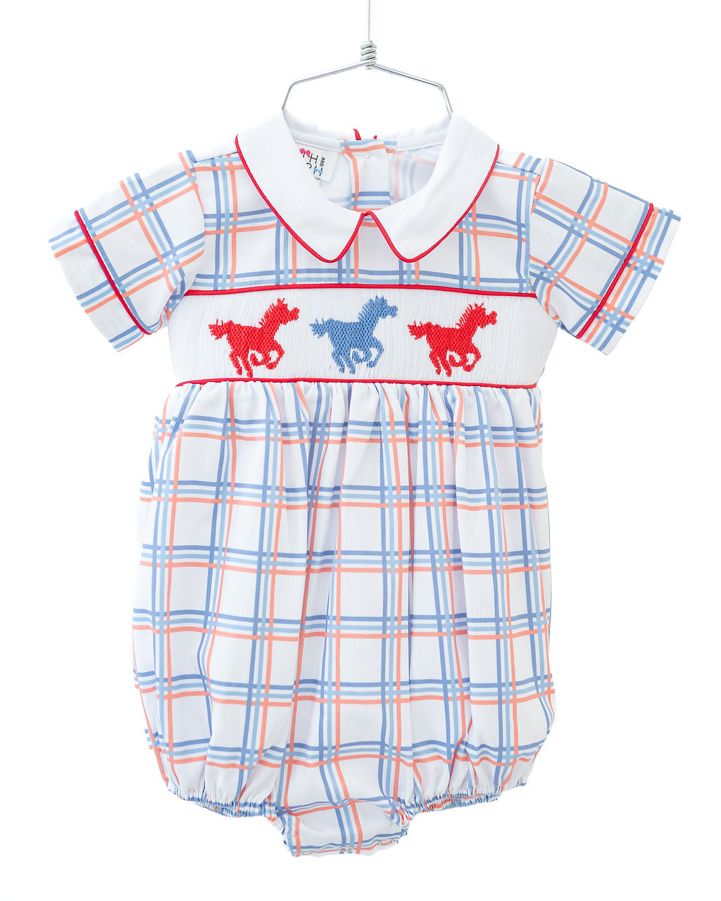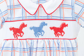 Your little football fan will look adorable in our Smocked Boy's Bubble! Made from a soft and durable blend of 65% polyester and 35% cotton, this smocked collared bubble features a charming design.