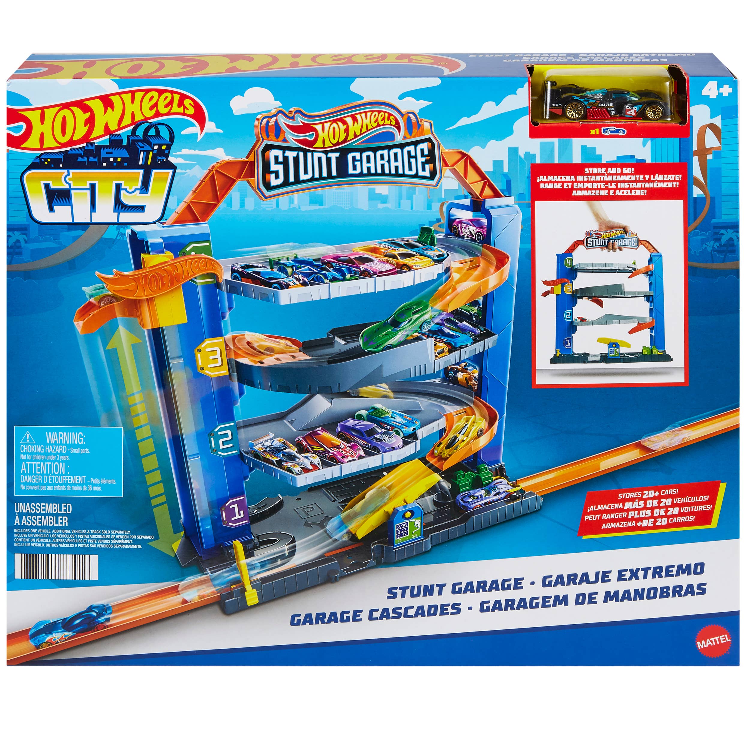 Kids can use the elevator to bring their cars up to the level they want and park there or drive down to the lower level. Four levels of parking and side display storage. Includes one vehicle. Ages 4Y+. Growth Channels.