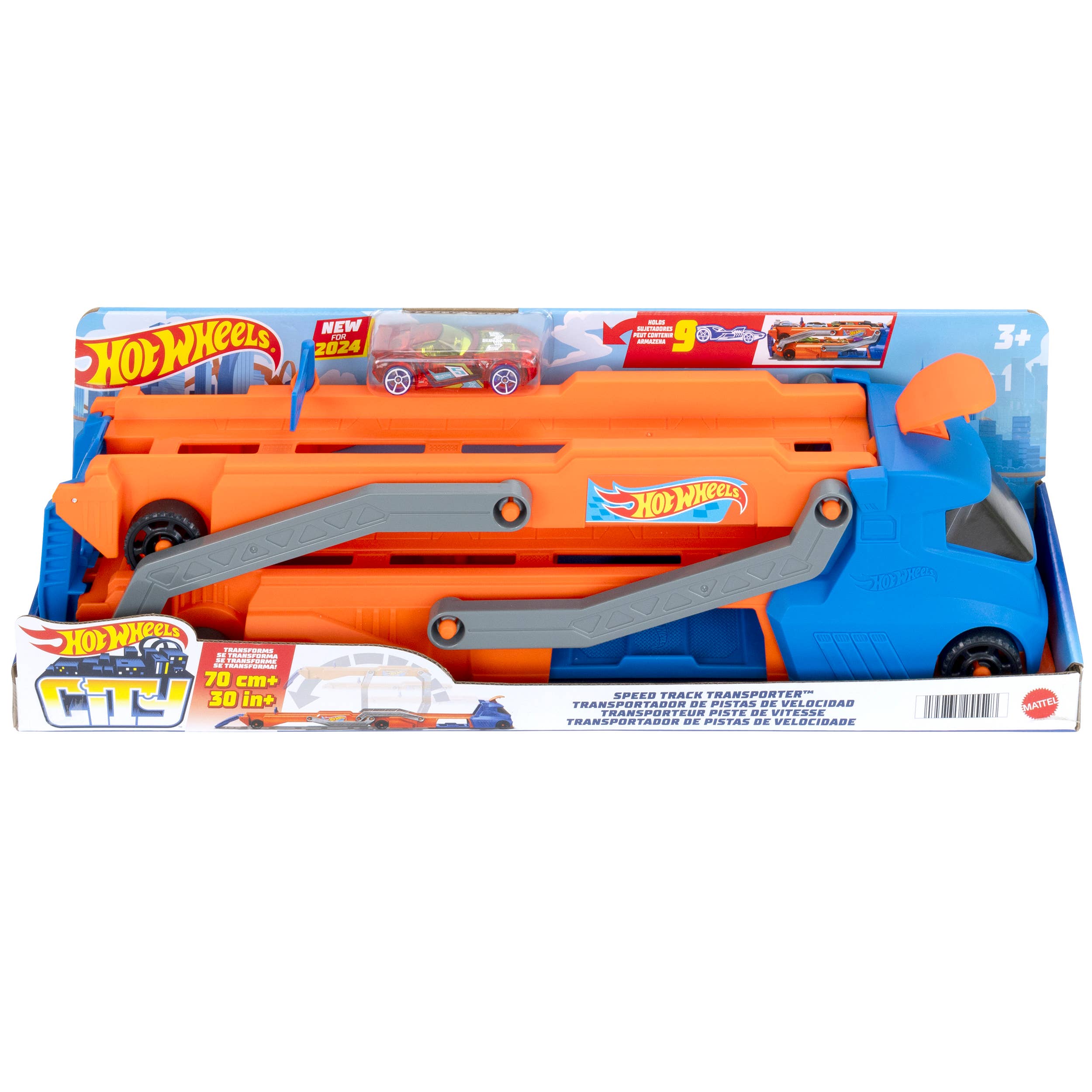 Massive hauler holds and stores up to 9 1:64 scale Hot Wheels cars. One car included. Pull out the truck bed to transform it into a 2.5 ft raceway. Cab doubles as a launcher. Ages 4Y+. Growth Channels.