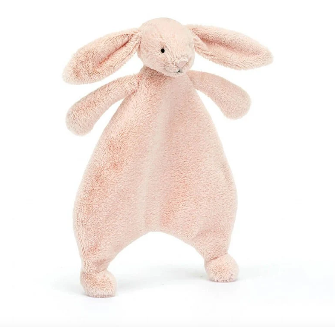 Introducing the Bashful Bunny Comforter, soft in a blush pink hue and made from recycled fibres. Designed for little hands to grab its arms and feet and an un-stuffed tummy to cuddle.