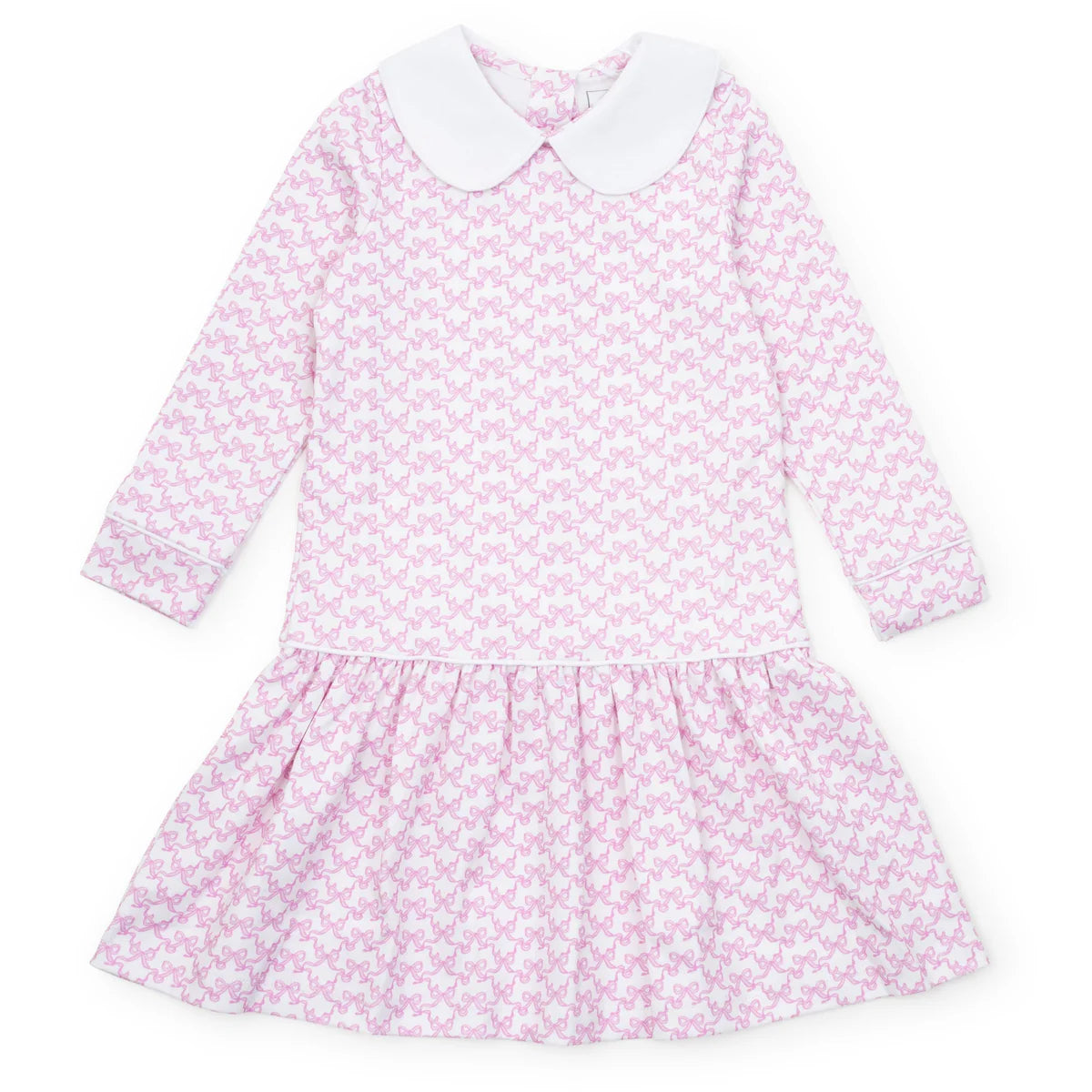Long sleeve pima cotton dress with peter pan collar and contrast piping. Drop waist ruffle skirt.