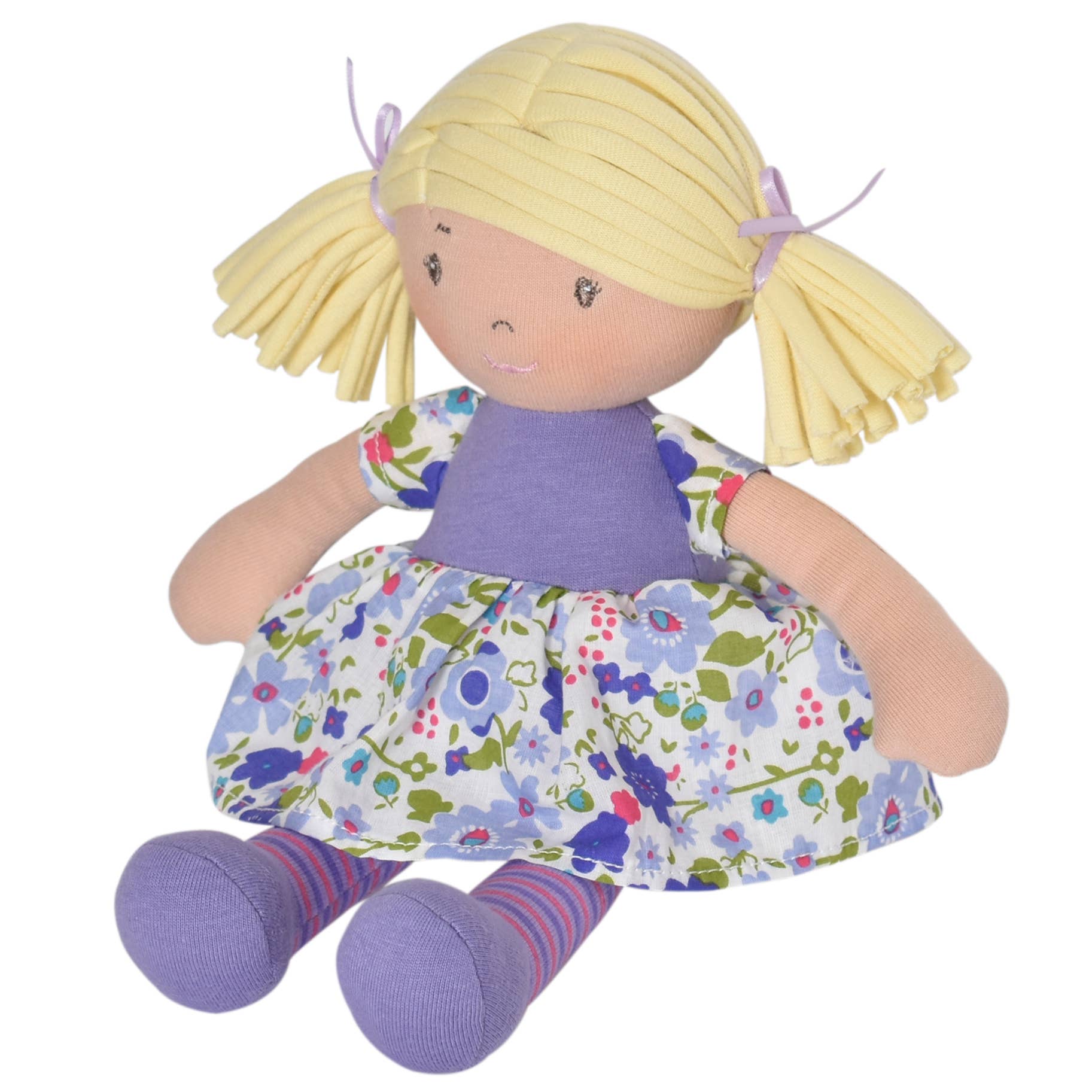 Features: Soft body rag doll with embroidered facial features and printed clothing.