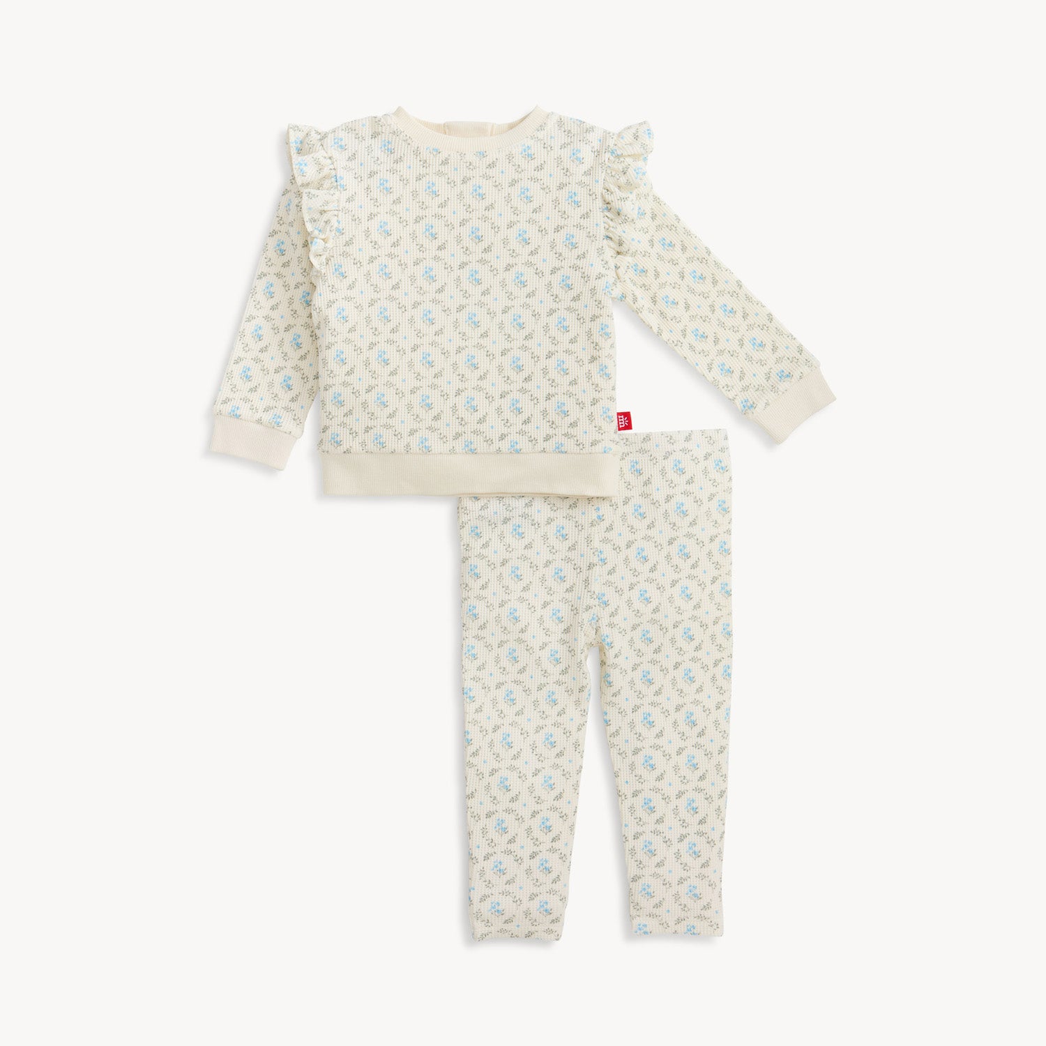 Adorable little set made of waffle cotton, magnetic neck opening make for easy on and off.