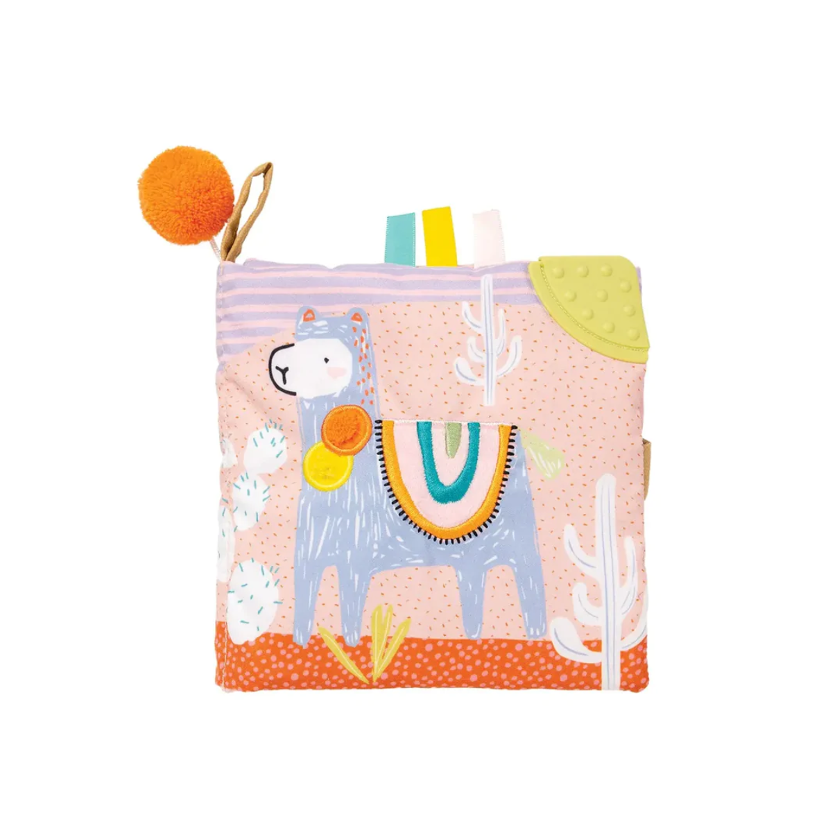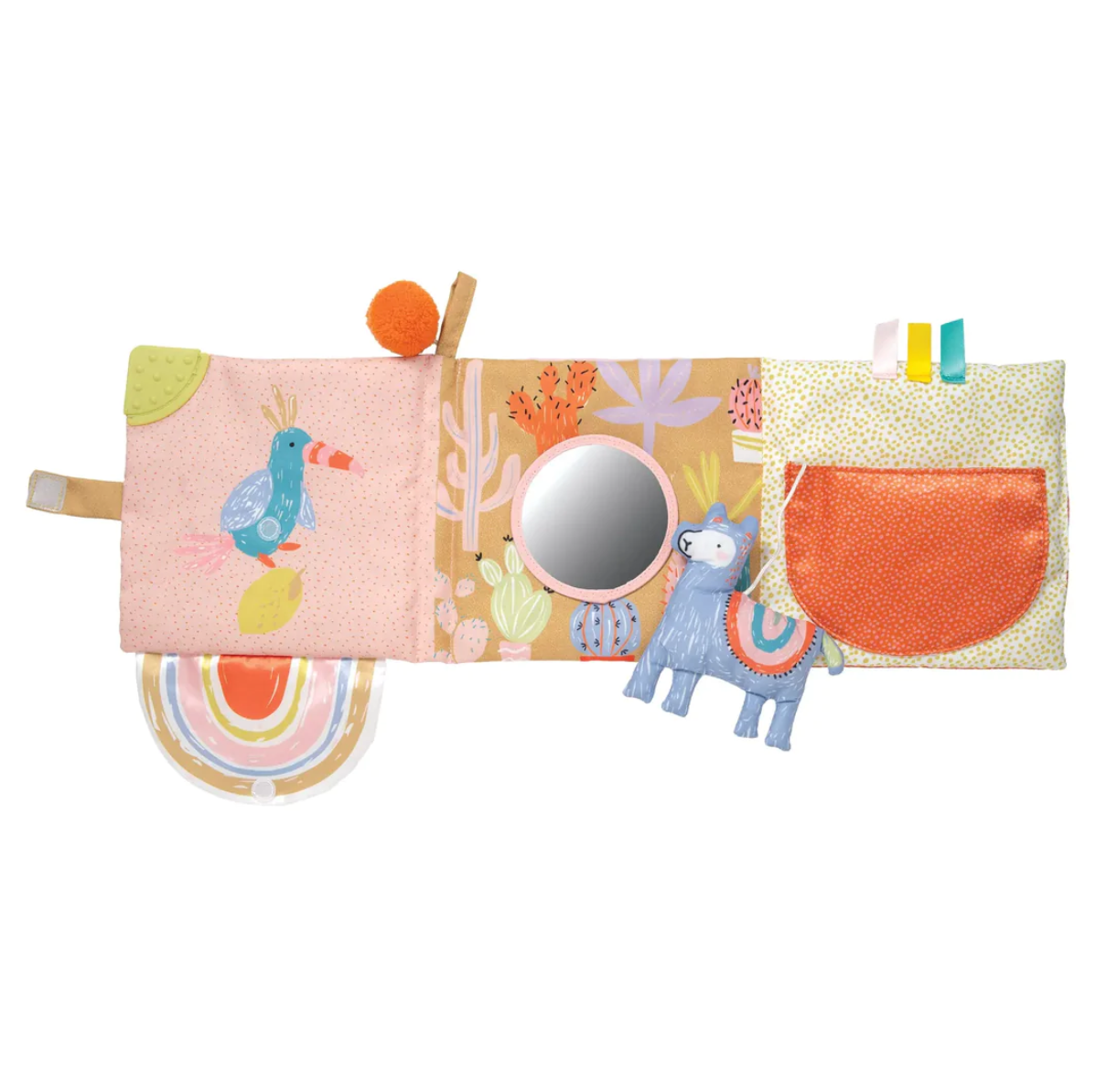 Follow the llama through different activities on each page. Folding soft book includes tethered-on squeaker llama, colorful illustrations, crinkly sounds, baby-safe mirror and engaging textures. Fabric loop allows for easy attachment to baby links. Encourages motor development, cause and effect learning. Keeps pages tidy with fabric closure.