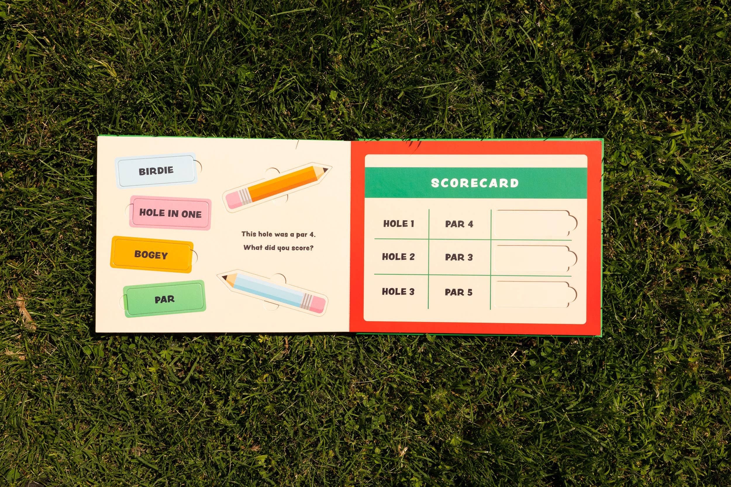 Lift-the-flap peekaboo panels and removable cardboard cut-outs that pop up, including a putter, golf ball, tee, and scorecard
