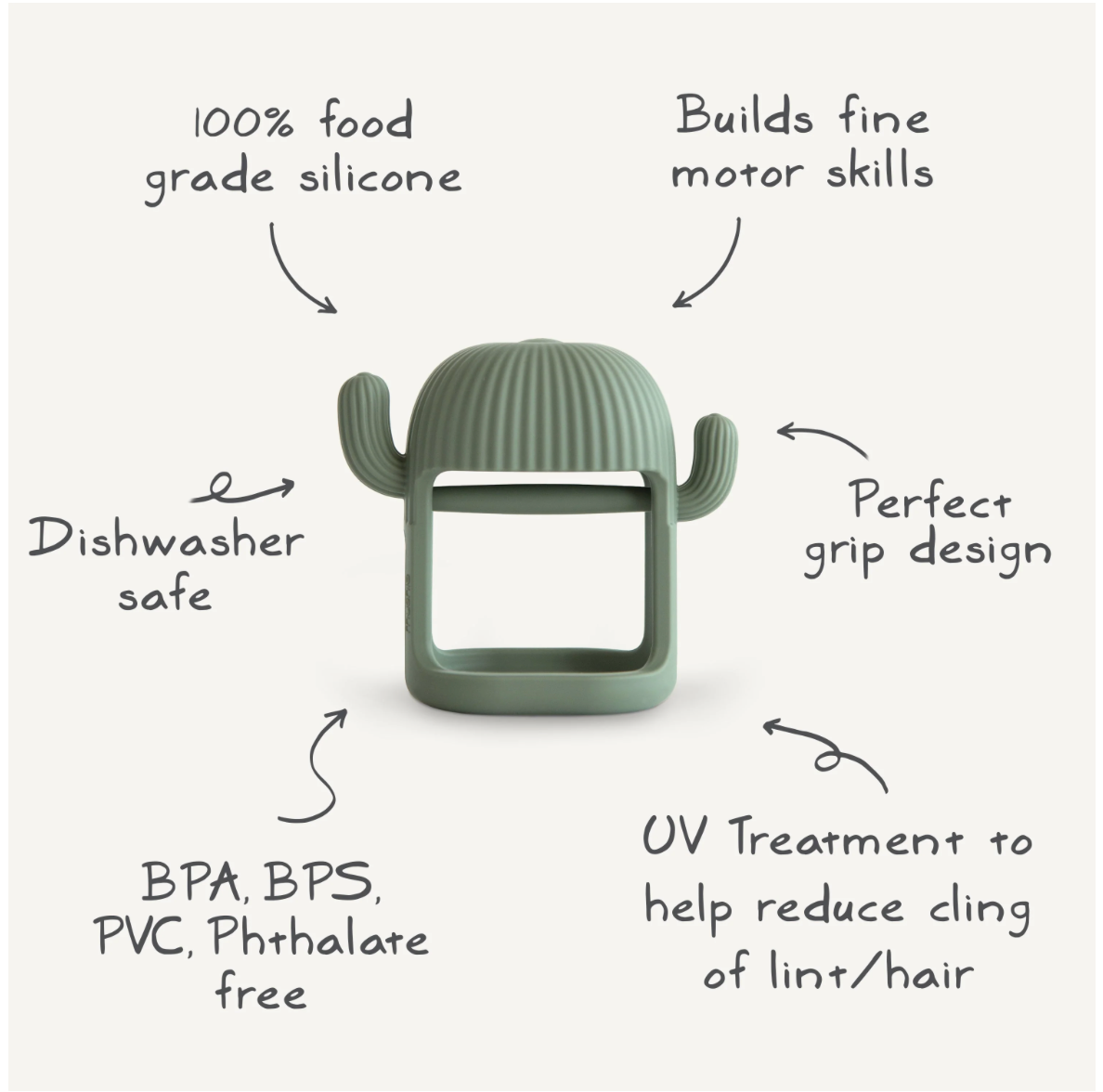 Help baby discover self-soothing techniques with our no-drop dino teether that supports the teething journey. With an interior handle that's easy to grasp without dropping, baby will enjoy holding tight and exploring the textured surface and soft edges. Made from 100% food grade silicone, this toy is safe for mouthing and chewing as littles seek relief for sore gums.