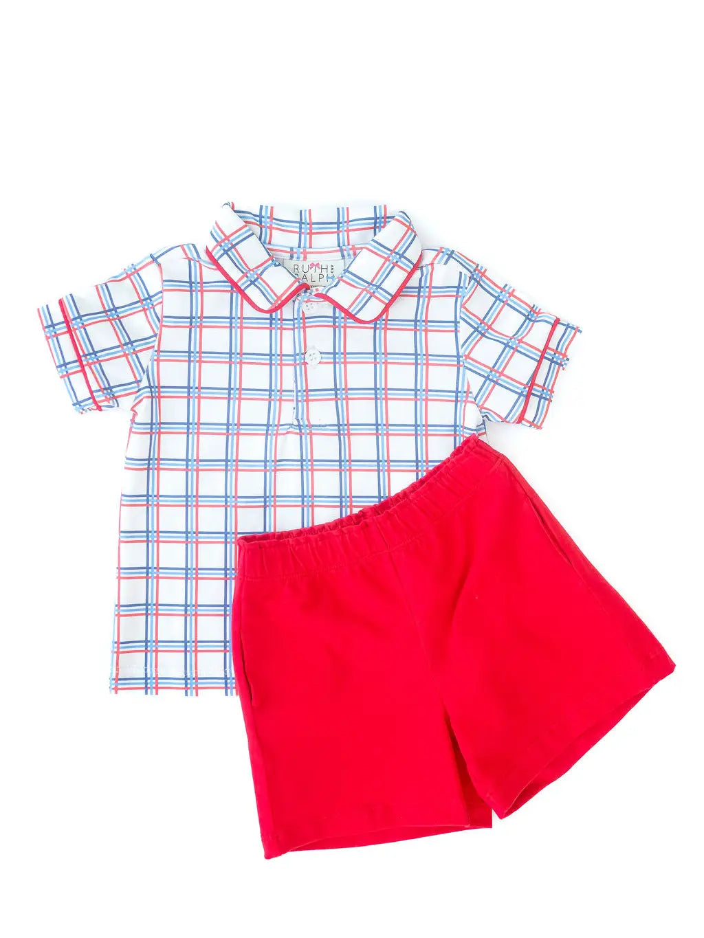 - Classic red, white, and blue plaid polo shirt with coordinating red shorts