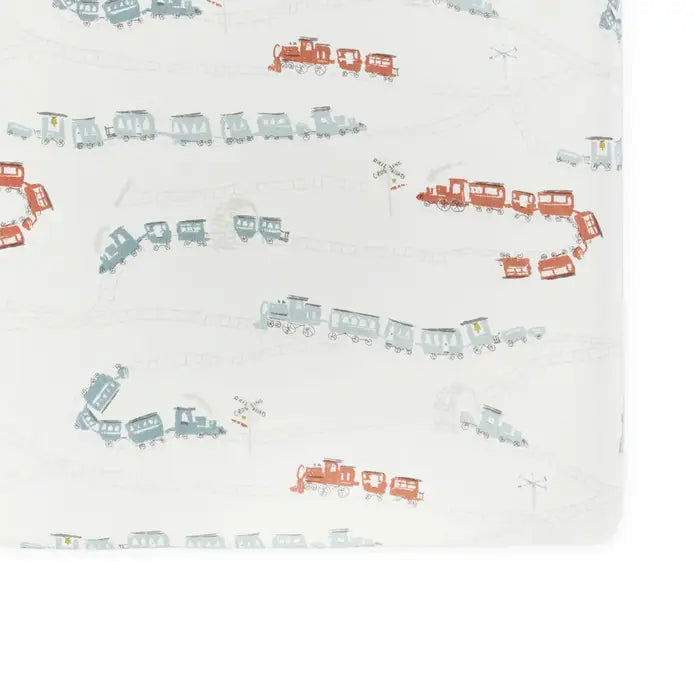 Soft, breathable, and made for sweet dreams. Crafted from GOTS certified 100% brushed organic cotton, our Locomotive Crib Sheet is breathable, gentle on sensitive skin, and stays soft wash after every wash. The subtle pattern adds a calming touch to any nursery, while the fully elasticized bottom seam ensures a snug, safe fit for standard crib mattresses up to 52" x 28" x 8".