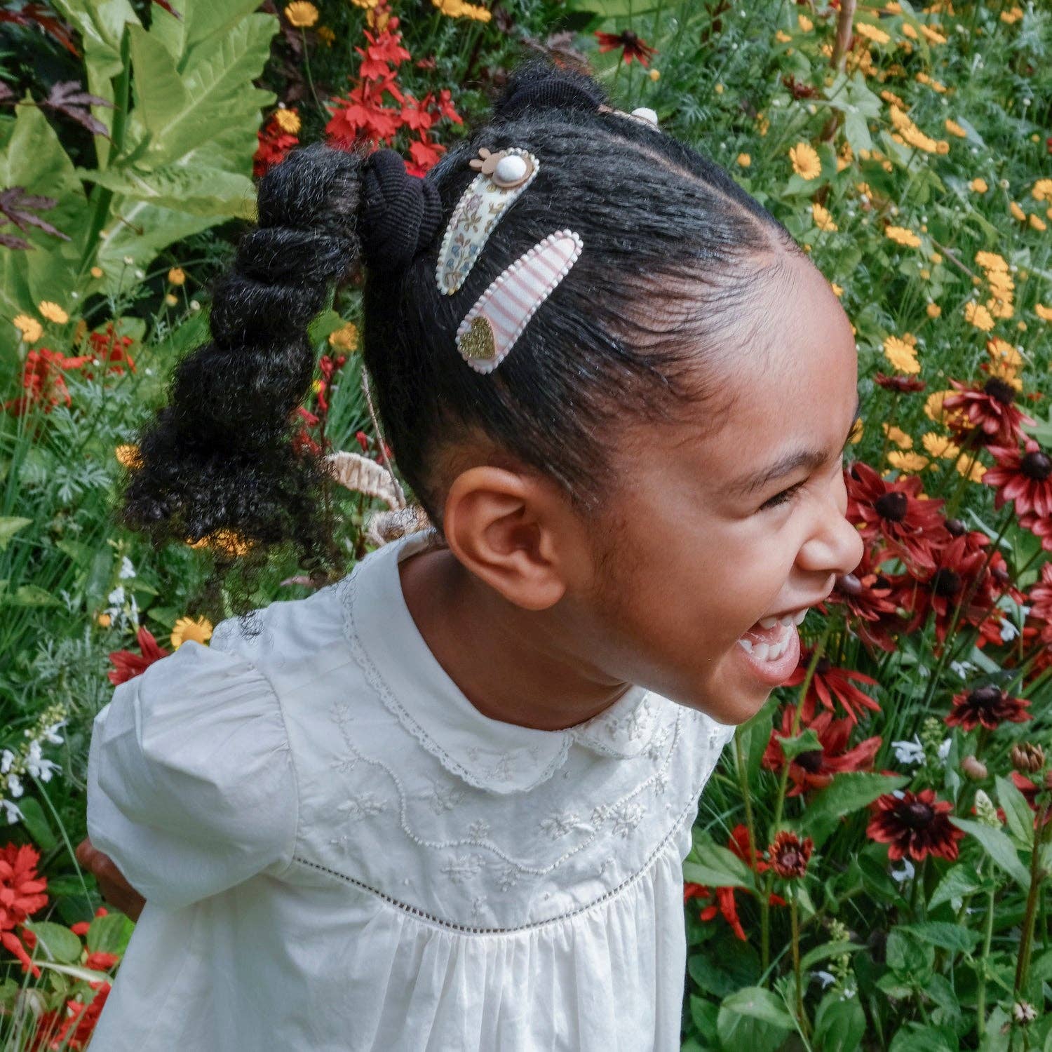 Mix and match this lovely pack of four clips, featuring our petal print with super cute bunny tails, paired together with glittery gold hearts on pink and white stripe fabric. Wear them one at a time, or all at once!