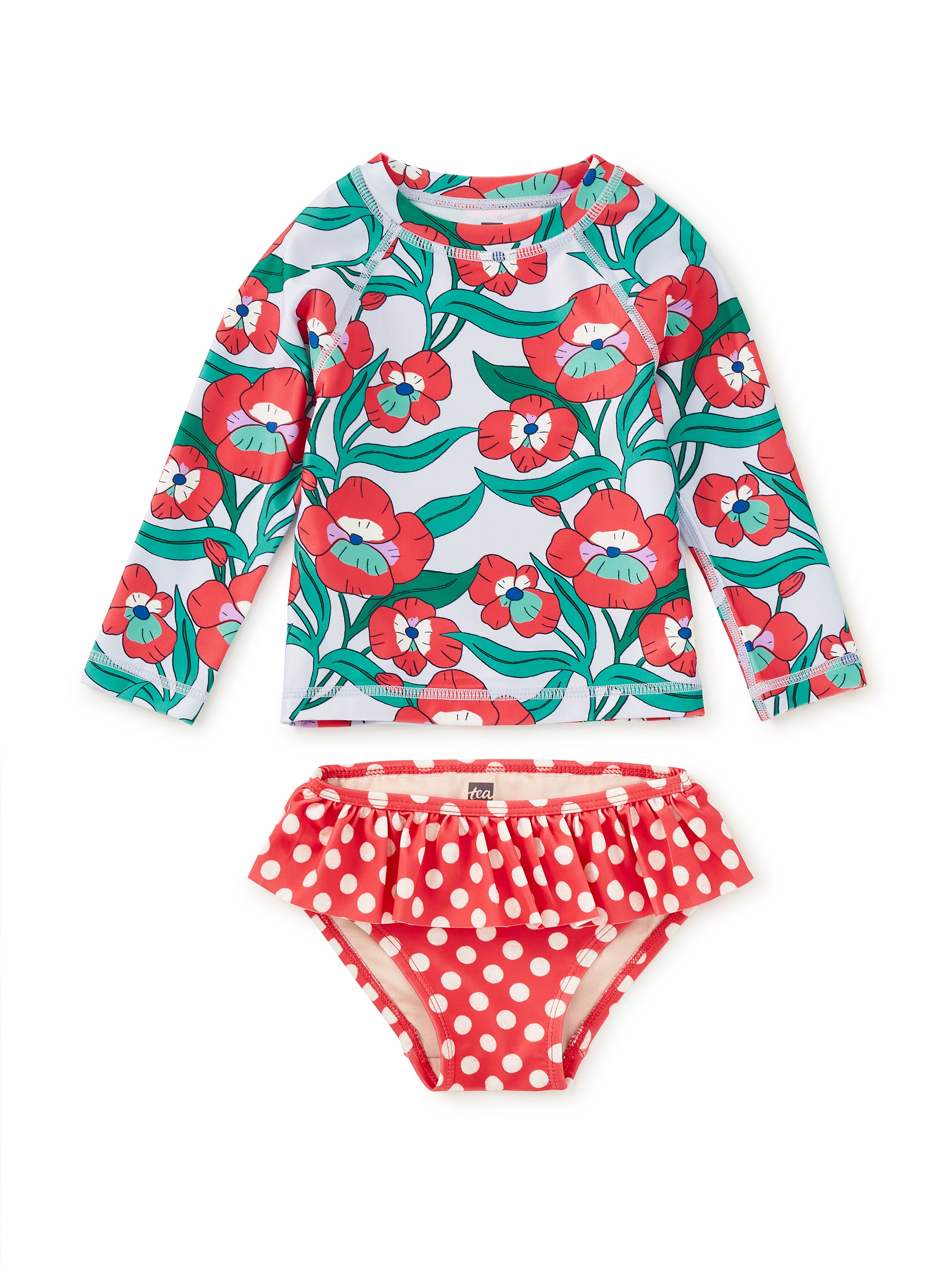 Made for first splashes, sunny pool days, and easy outfit changes, this two-piece baby swim set combines thoughtful coverage with sweet, playful style. The long-sleeve rash guard features a fitted silhouette with raglan sleeves and a lined front bodice, offering UPF 50+ sun protection to help cut down on sunscreen during busy water days. The matching bottoms are fully lined with a soft ruffle waist for a comfortable, stay-put fit that still feels special. Crafted from recycled materials and finished with an artist-designed print created in-house, this set is built to last splash after splash. A perfect choice for baby's early swim moments--and an easy match-back option for coordinated family swim days.