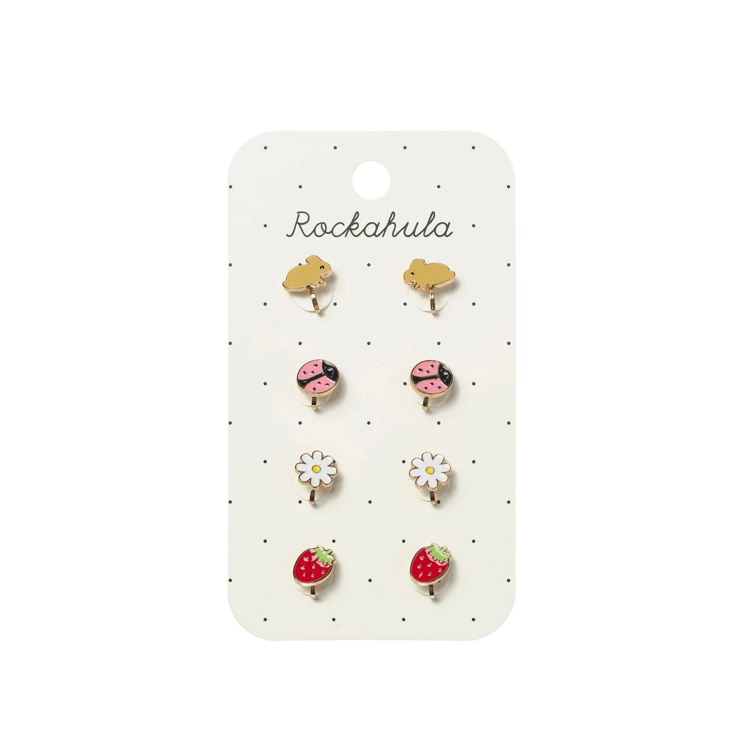 Add a touch of spring to your day with this set of clip on earrings. This sweet four pack features a set of spring time favourites including bunnies, ladybirds, daisies and juicy strawberries - all sat on metal gold clips. Each piece clips on gently (no pierced ears needed) and have been designed with little ears in mind!